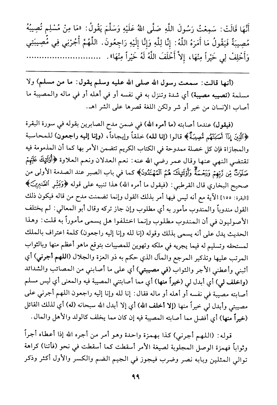 (أنها قالت: سمعت رسول الله - صلى الله عليه وسلم - يقول: ما من مسلم) ولا مسلمة (تصيبه مصيبة) أي شدة وتنزل به في نفسه أو في أهله أو في ماله والمصيبة ما أصاب الإنسان من خير أو شر ولكن اللغة قصرها على الشر اهـ.