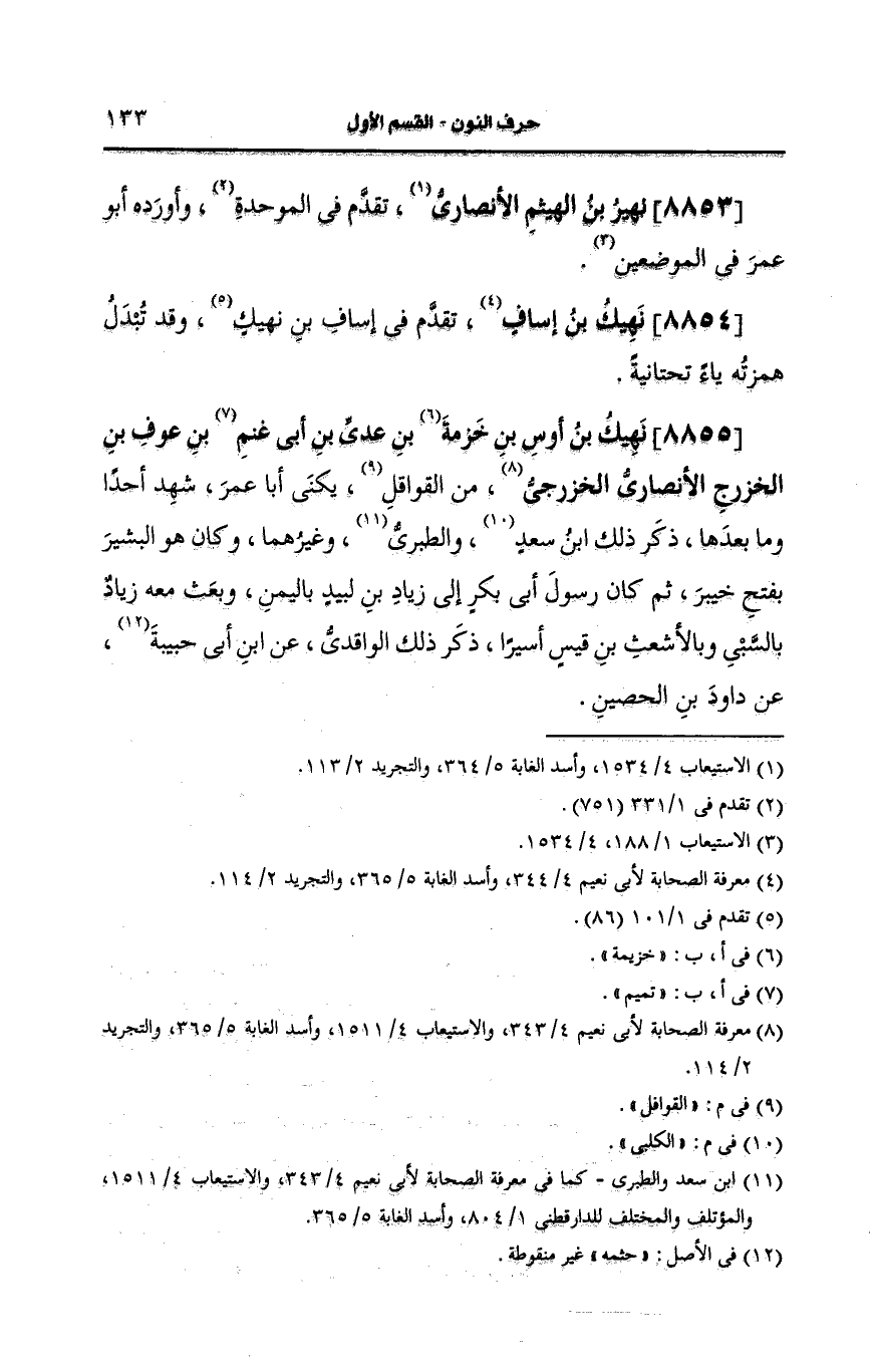 8855- نهيك بن أوس بن خزمة بن عَدِيّ بن أبي غنم بن عوف بن الخزرج، الأَنصارِيّ الخزرجي.