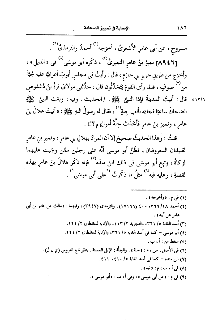قلت: وهذا الحديث صحيح الا أن المراد بهلال بن عامر ونمير بن عامر القبيلتان المعروفتان فظن أَبو موسى أنه عنى رجلين ممن وجبت عليهما الزكاة وتبع أَبو موسى في ذلك ابن مَنْدَه فأنه ذكر هلال بن عامر بهذه القصة وعليه نبه مثل ما ذكرت، عَن أبي موسى.