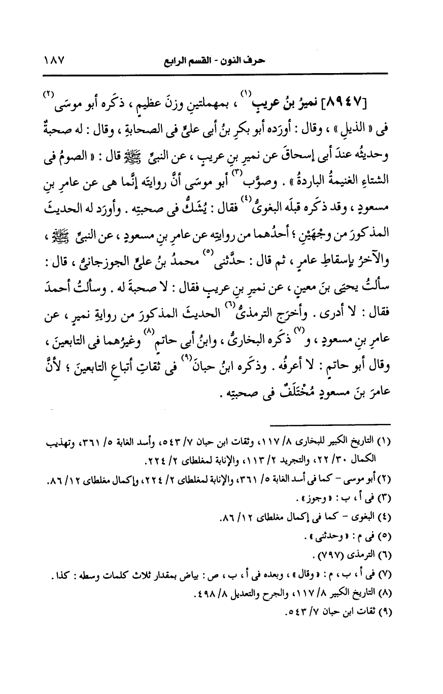 وصوب أَبو موسى أن روايته إنما هي، عَن عامر بن مسعود وقد ذكره قبله البغوي فقال يشك في صحبته وأورد له الحديث المذكور من وجهين أحدهما من روايته، عَن عامر بن مسعود عَنِ النَّبِيِّ صَلى الله عَلَيه وسَلم والآخر بإسقاط عامر ثم قال وحدثني محمد بن علي الجوزجاني قال سألت يحيى بن مَعِين، عَن نمير بن عريب فقال لا صحبة له وسألت أَحمد فقال لا أدري وأخرج التِّرمِذيّ الحديث المذكور من رواية نمير، عَن عامر بن مسعود وقال ذَكَرَهُ البُخَارِيُّ، وابن أبي حاتم وغيرهما في التابعين وقال أَبو حاتم لا أعرفه وذكره ابن حبان في ثقات أتباع التابعين لأن عامر بن مسعود مُخْتَلَفٌ في صُحْبَتِهِ.