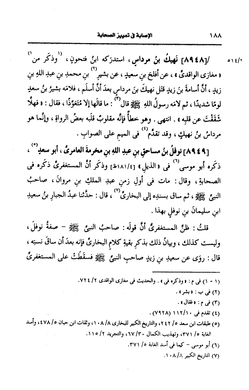 قلت: ظن المستغفري أن قوله صاحب النَّبيّ صَلى الله عَلَيه وسَلم صفة نوفل وليست كذلك وبيان ذلك بذكر بقية كلام البُخارِيّ فأنه بعد أن ساق نسبه قال روى، عَن سعيد بن زيد صاحب النَّبيّ صَلى الله عَلَيه وسَلم فسقطت على المستغفري هذه الجملة فوقع الوهم ونوفل المذكور تابعي معروف أخرج له أَبو داود وحديثه، عَن سعيد بن زيد من أربى الربا الاستطالة في عرض المسلم بغير حق وله ترجمة في تهذيب الكمال.