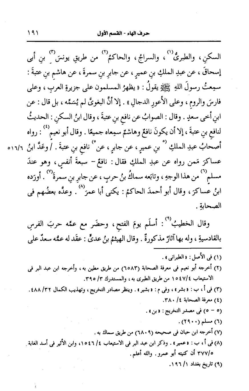وقال ابن السَّكَن: الحديث لنافع بن عتبة الا أن يكون نافع وهاشم سمعاه جميعاً.