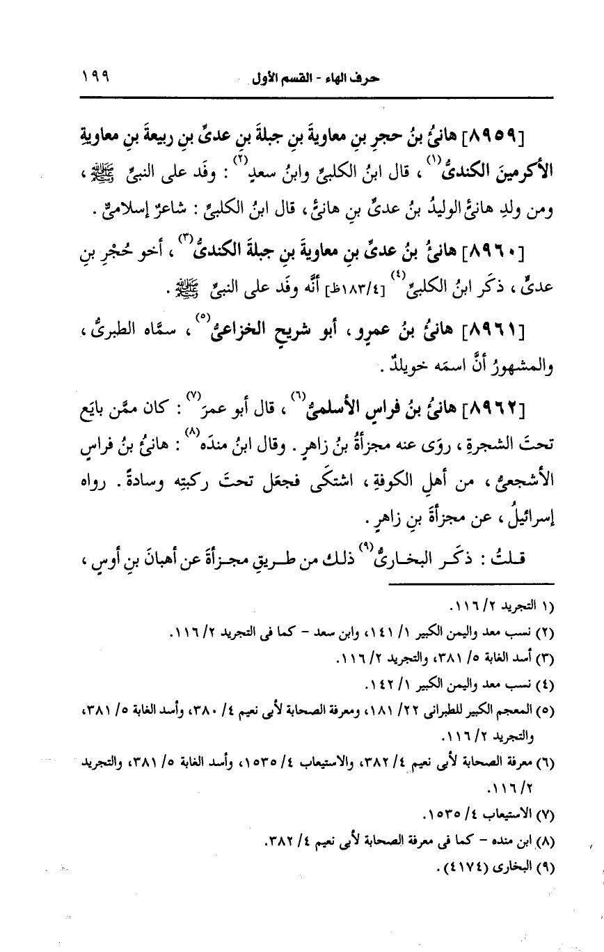 8959- هانئ بن حجر بن معاوية بن جبلة بن عَدِيّ بن ربيعة بن معاوية الأكرمين الكندي.