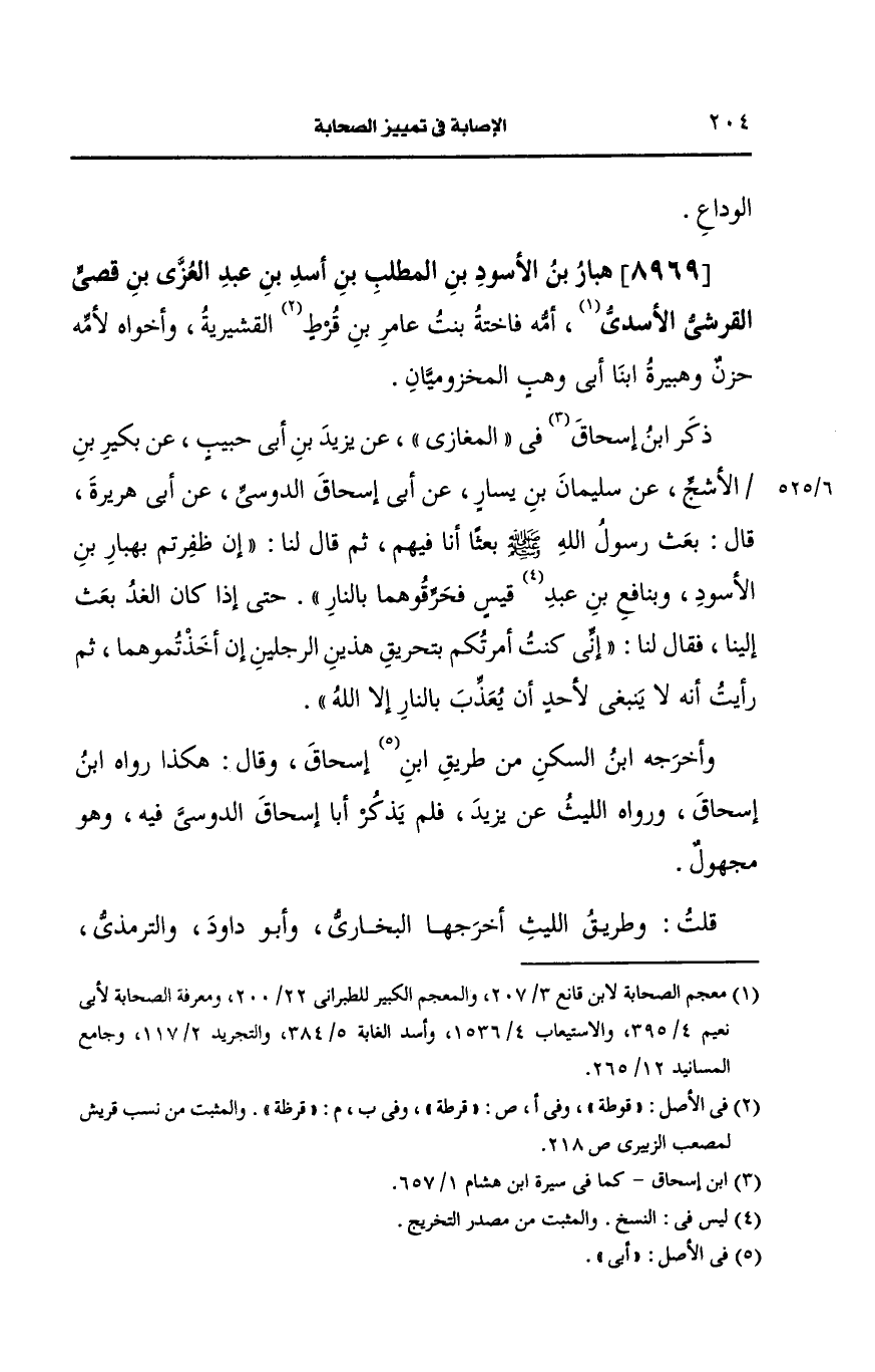 ذكر بن إسحاق في المغازي، عَن يزيد بن أبي حبيب، عَن بكير بن الأشج عن سليمان بن يسار، عَن أبي إسحاق الدوسي، عَن أبي هريرة قال بعث رسول الله صَلى الله عَلَيه وسَلم بعثا أنا فيهم ثم قال لنا ان ظفرتم بهبار بن الأَسود وبنافع بن قيس فحرقوهما بالنار حتى إذا كان الغد بعث إلينا فقال لنا اني كنت أمرتكم بتحريق هذين الرجلين ان أخذتموهما ثم رأيت انه لا ينبغي لأحد أن يعذب بالنار الا الله.