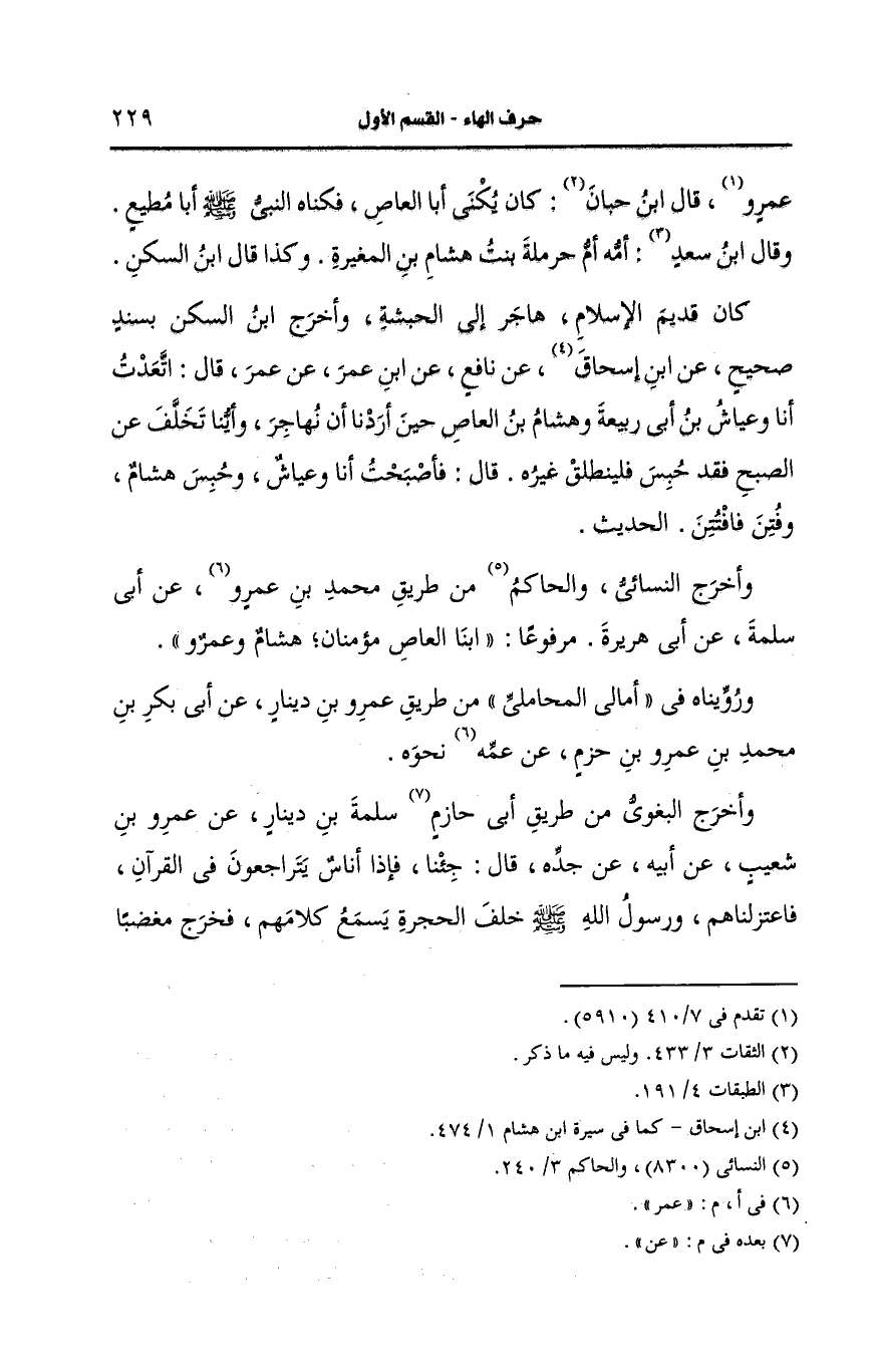 وأخرج النسائي والحاكم من طريق محمد بن عمر، عَن أبي سلمة، عَن أبي هريرة مَرْفُوعًا ابنا العاص مؤمنان هشام وعمرو".