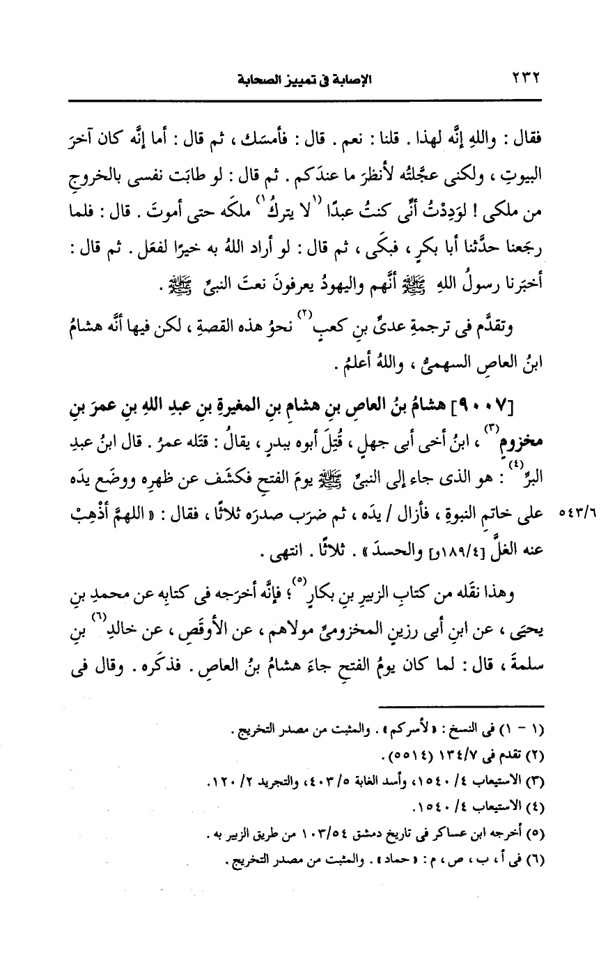 وهذا نقله من كتاب الزبير بن بكار فإنه أَخرجه في كتابه، عَن محمد بن يحيى، عَن ابن أبي رزين المخزومي مولاهم، عَن الأوقص، عَن حماد بن سلمة قال لما كان يوم الفتح جاء هشام بن العاص فذكره وقال في آخره، وكان الأوقص يقول نحن أقل أصحابنا حسدا ثم من طريق ابن شهاب قال عمر لسعيد بن العاص الأموي ما قتلت أباك إنما قتلت خالي العاص بن هشام.
