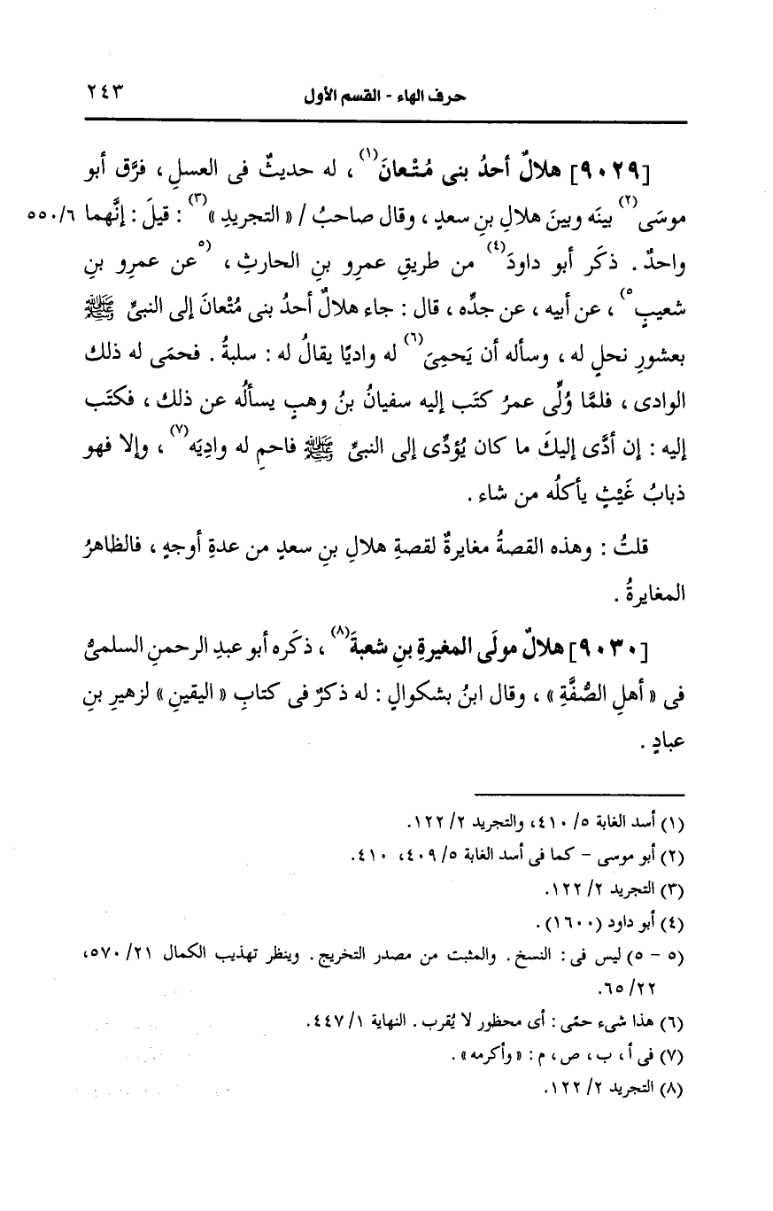 وقال صاحب التجريد قيل انهما واحد ذكر أَبو داود من طريق عَمرو بن الحارث، عَن أَبيه، عَن جَدِّه قال جاء هلال أحد بني متعان إِلَى النَّبِيِّ صَلى الله عَلَيه وسَلم بعشور نحل له وسأله أن يحمي له واديا يُقَالُ لَهُ: سلبة فحمى له ذلك الوادي فلما ولي عمر كتب اليه سفيان بن وهب يسأله، عَن ذلك فكتب اليه ان أدي إليك ما كان يؤدى إِلَى النَّبِيِّ صَلى الله عَلَيه وسَلم فاحم له وأكرمه والا فهو ذباب غيث يأكله من شاء.