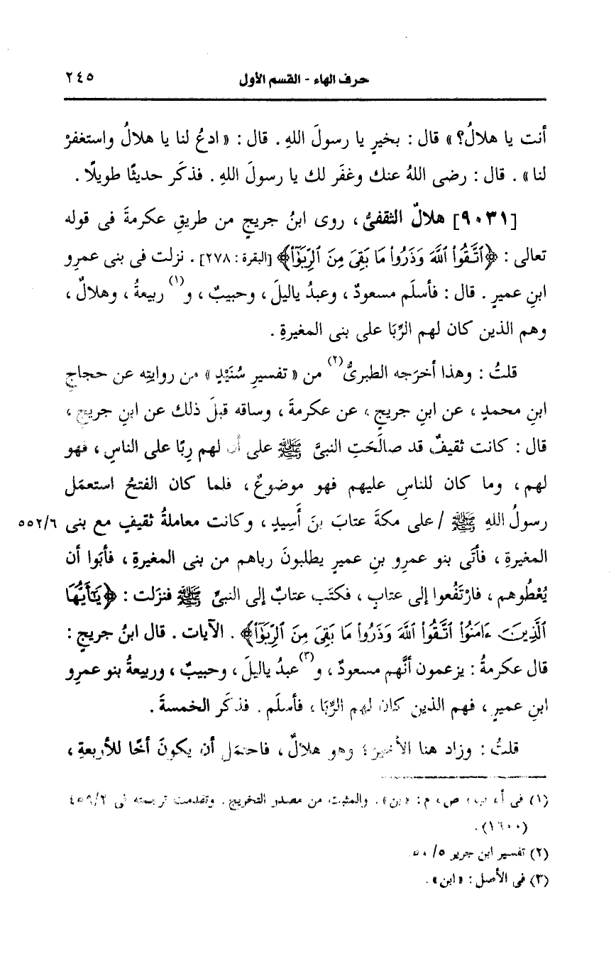 قلت: وهذا أَخرجه الطَّبَرِي من تفسير سنيد من روايته، عَن حجاج بن محمد، عَن ابن جريج، عَن عكرمة وساقه قبل ذلك، عَن ابن جريج قال كانت ثقيف قد صالحت النَّبيّ صَلى الله عَلَيه وسَلم على أن لهم ربا على الناس فهو لهم وما كان للناس عليهم فهو موضوع فلما كان الفتح استعمل رسول الله صَلى الله عَلَيه وسَلم على مكة عَتَّاب بن أَسِيْد وكانت معاملة ثقيف مع بني المغيرة فأتى بنو عَمرو بن عمير يطلبون رباهم من بني المغيرة فأبوا أن يعطوهم فارتفعوا الى عتاب فكتب عتاب إِلَى النَّبِيِّ صَلى الله عَلَيه وسَلم فنزلت ?يا أيها الذين آمنوا اتقوا الله وذروا ما بقي من الربا? الآية قال ابن جريج قال عكرمة ويزعمون أنهم مسعود وعبد ياليل وحبيب وربيعة بنو عَمرو بن عمير فهم الذين كان لهم الربا فأسلم فذكر الخمسة.