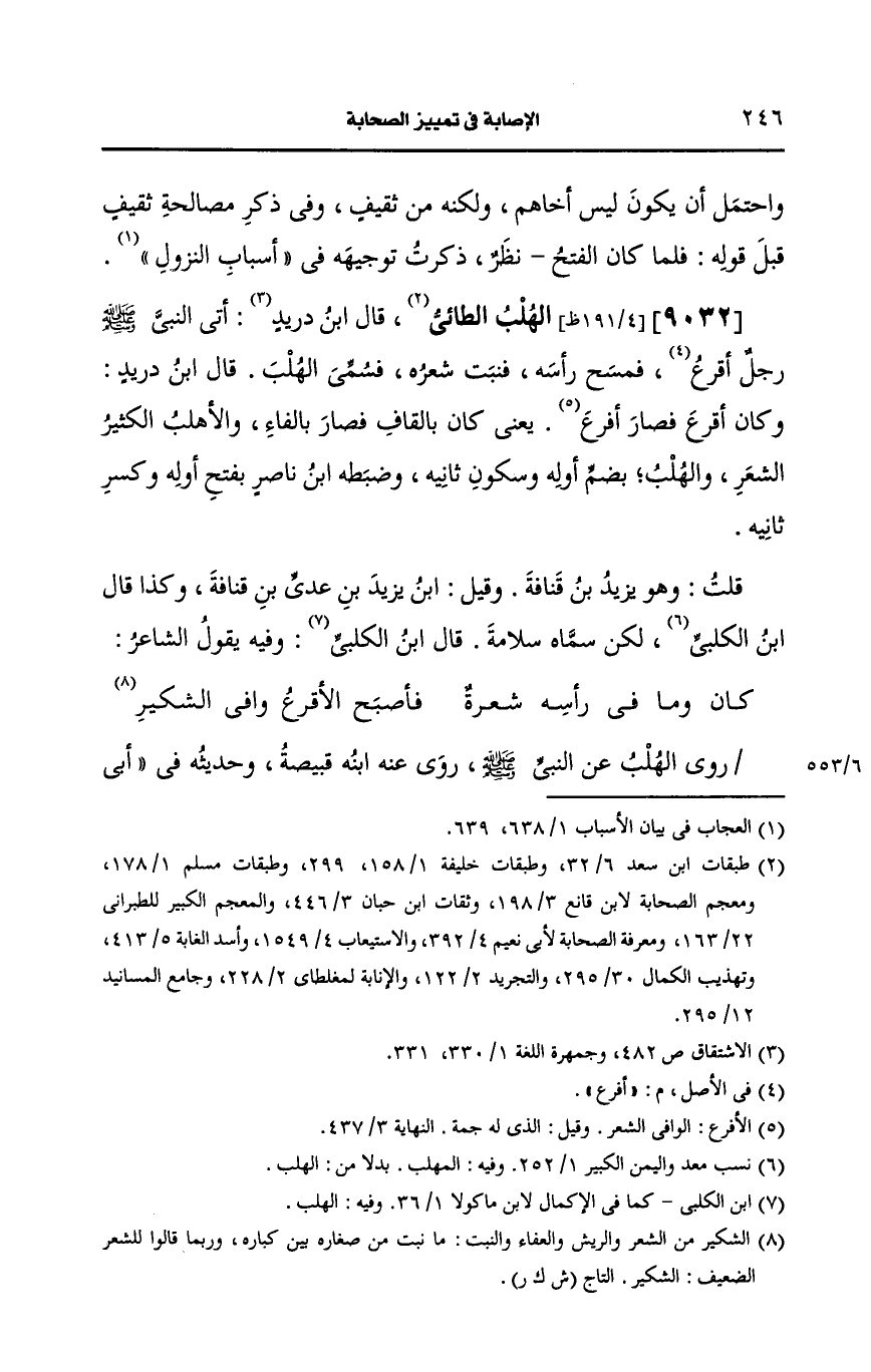 قال ابن دريد أتى النَّبيّ صَلى الله عَلَيه وسَلم رجل أفرع فمسح رأسه فنبت شعره فسمى الهلب قال ابن دريد، وكان أقرع فصار أفرع يعني كان بالقاف فصار بالفاء والأهلب الكثير الشعر. والهلب بضم أوله وسكون ثانيه وضبطه بن ناصر بفتح أوله وكسر ثانيه.