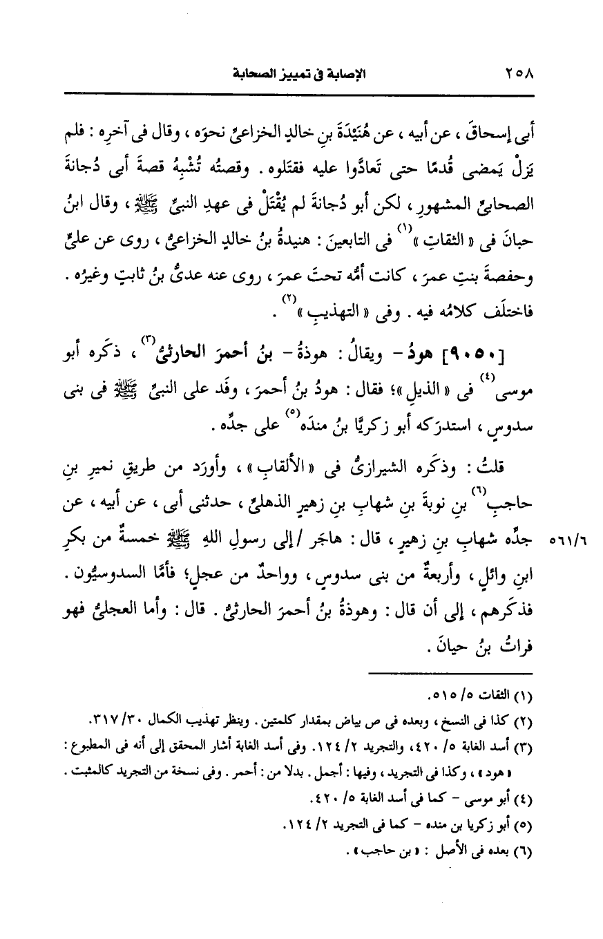 قلت: وذكره الشيرازي في الألقاب وأورد من طريق نمير بن حاجب بن نوبة بن شهاب بن زهير الذهلي حدثني أبي، عَن أَبيه، عَن جَدِّه شهاب بن زهير قال هاجر الى رسول الله صَلى الله عَلَيه وسَلم خمسة من بكر بن وائل وأربعة من بني سدوس وواحد من عجل فأما السدوسيون فذكرهم الى أن قال وهوذة بن أحمر، الحارِثيّ قال وأما العجلي فهو فرات بن حيان.