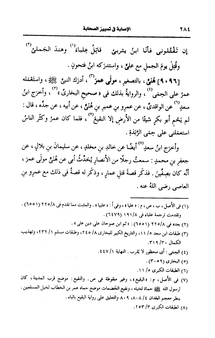 وأخرج ابن سَعد أيضًا، عَن خالد بن مخلد، عَن سليمان بن بلال، عَن جعفر بن محمد سمعت رجلا من الأنصار يحدث أبي، عَن هنى مولى عمر أنه كان بصفين فذكر قصة قتل عمار وذكر له قصة في ذلك مع عَمرو بن العاص.