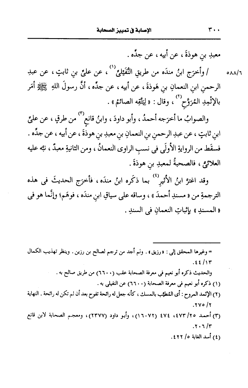 وأخرج ابن مَنْدَه من طريق النفيلي، عَن علي بن ثابت، عَن عبد الرحمن بن النعمان بن هوذة، عَن أَبيه، عَن جَدِّه أن رسول الله صَلى الله عَلَيه وسَلم أمر بالأثمد المروح وقال "ليتقه الصائم". والصواب ما أَخرجه أَحمد، وأَبو داود، وابن قانع من طرق، عَن علي بن ثابت، عَن عبد الرحمن بن النعمان بن معبد بن هوذة، عَن أَبيه، عَن جَدِّه فسقط من الرواية الأولى في نسب الراوي النعمان ومن الثانية معبد نبه عليه العلائي فالصحبة لمعبد بن هوذة.