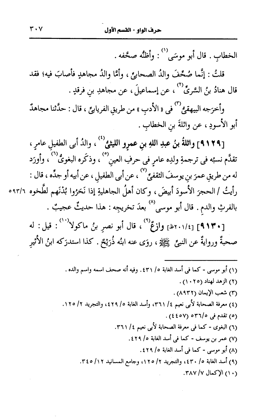 9129- واثلة بن عَبد الله بن عَمرو الليثي والد أبي الطفيل عامر.