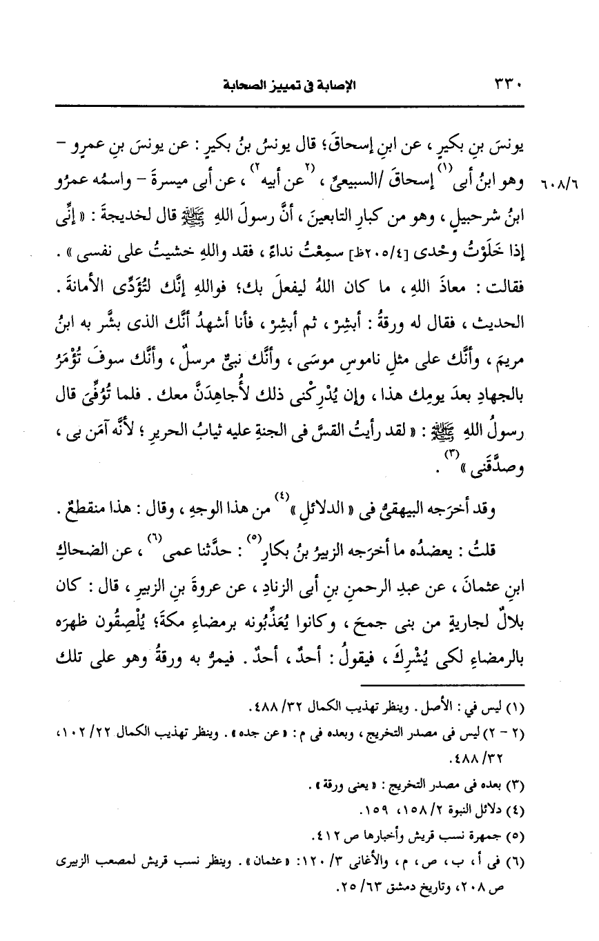 قلت: يعضده ما أَخرجه الزبير بن بكار، حَدَّثنا عثمان، عَن الضحاك بن عثمان، عَن عبد الرحمن بن أبي الزناد، عَن عُروَة بن الزبير، قال: كان بلال لجارية من بني جمح وكانوا يعذبونه برمضاء مكة يلصقون ظهره بالرمضاء لكي يشرك فيقول أحد أحد فيمر به ورقة وهو على تلك الحال فيقول أحد أحد يا بلال والله لئن قتلتموه لأتخذنه حنانا.