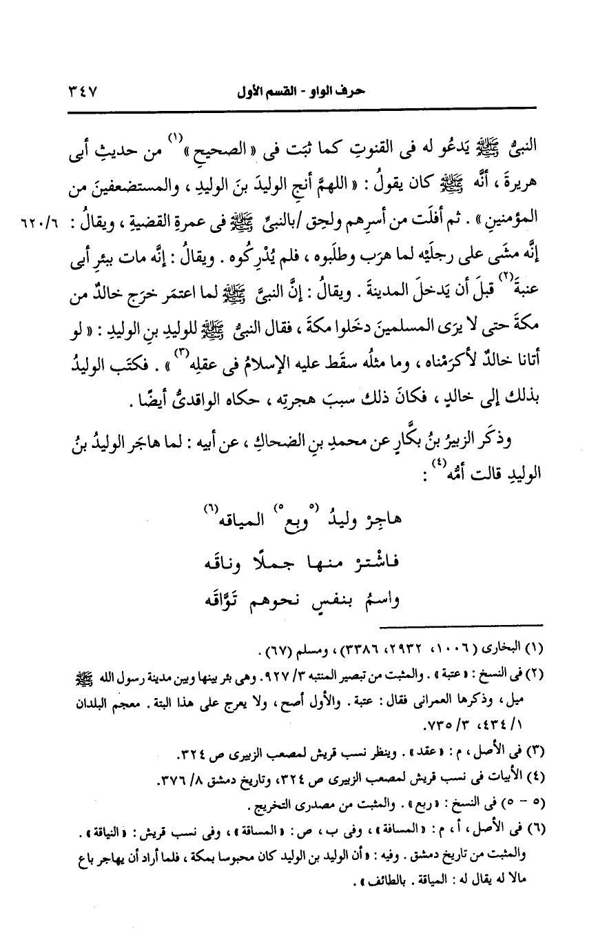 فكتب الوليد بذلك الى خالد فكان ذلك سبب هجرته حكاه الواقدي أيضًا وذكر الزبير بن بكار، عَن محمد بن الضحاك، عَن أَبيه لما هاجر الوليد بن الوليد قالت أمه: