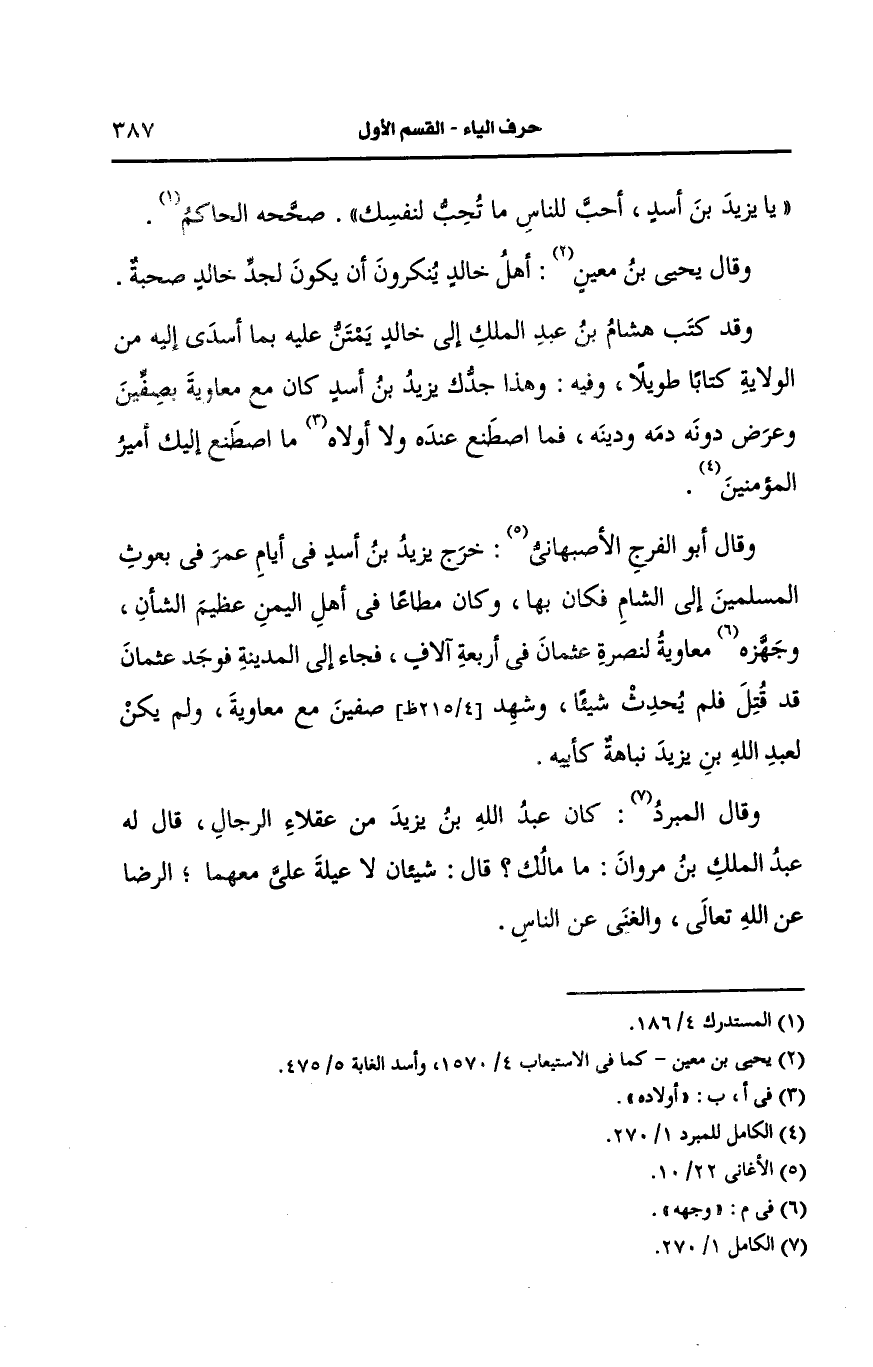 وقال يحيى بن مَعِين أهل خالد ينكرون أن يكون لجد خالد صحبة وقد كتب هشام بن عبد الملك الى خالد يمتن عليه بما أسدى اليه من الولاية كتابا طويلا وفيه وهذا جدك يزيد بن أسد كان مع معاوية بصفين وعرض دونه دمه ودينه فما اصطنع عنده ولا أولاه ما اصطنع إليك أمير المؤمنين.