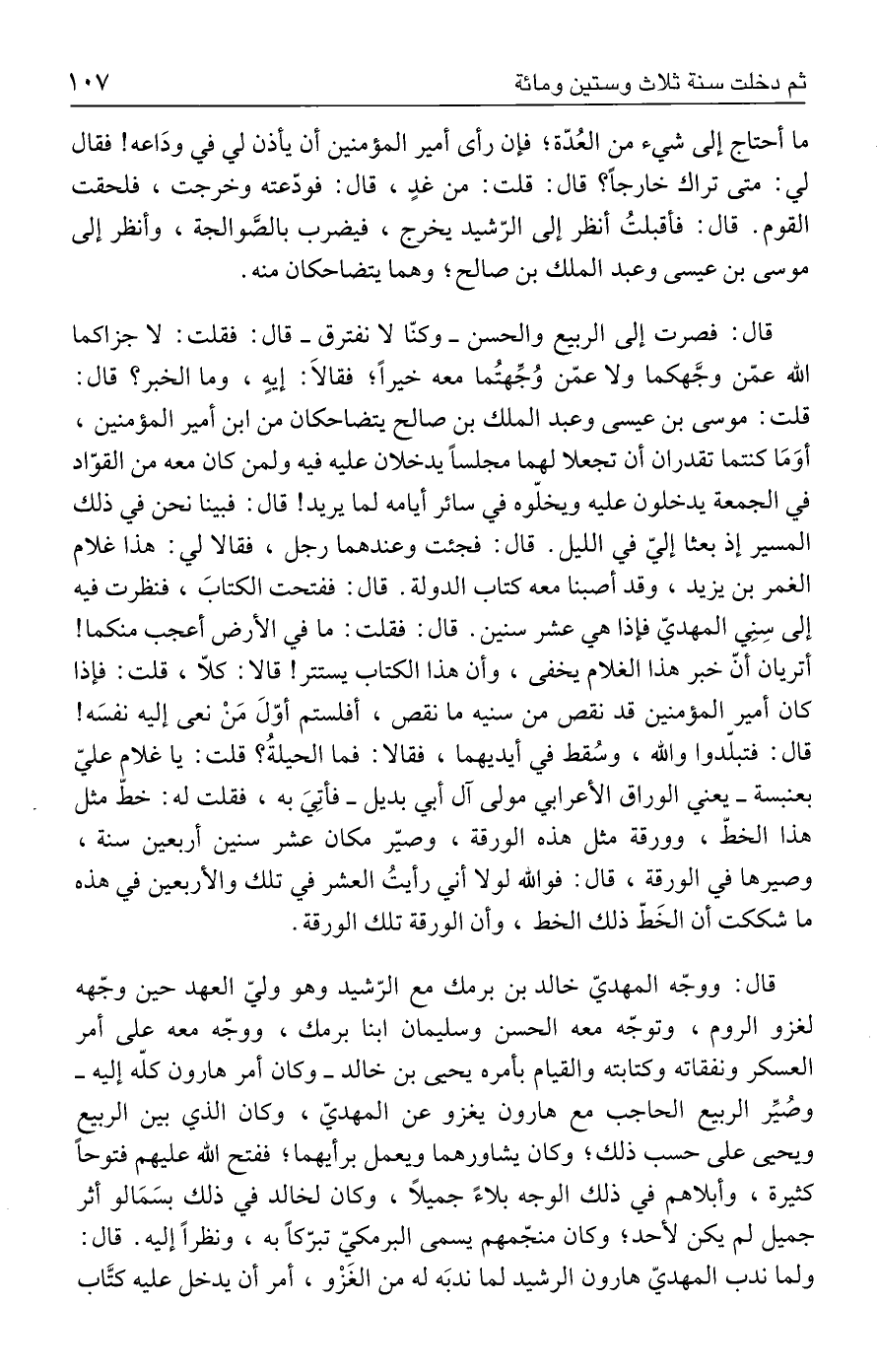 قال: فصرت إلى الرَّبيع والحسن - وكنّا لا نفترق - قال: فقلت: لا جزاكما الله عمّن وجَّهكما ولا عمّن وُجِّهتُما معه خيرًا؛ فقالَا: إيهٍ، وما الخبر؟ قال: قلت: موسى بن عيسى وعبد الملك بن صالح يتضاحكان من ابن أمير المؤمنين، أوَمَا كنتما تقدران أن تجعلا لهما مجلسًا يدخلان عليه فيه ولمن كان معه من القوّاد في الجمعة يدخلون عليه ويخلّوه في سائر أيامه لما يريد! قال: فبينا نحن في ذلك المسير إذ بعثا إليّ في الليل. قال: فجئت وعندهما رجل، فقالا لي: هذا غلام الغمر بن يزيد، وقد أصبنا معه كتاب الدولة. قال: ففتحت الكتابَ، فنظرت فيه إلى سِنِي المهديّ فإذا هي عشر سنين. قال: فقلت: ما في الأرض أعجب منكما! أتريان أنّ خبر هذا الغلام يخفى، وأن هذا الكتاب يستتر! قالا: كلّا، قلت: فإذا كان أمير المؤمنين قد نقص من سنيه ما نقص، أفلستم أوّلَ مَنْ نعى إليه نفسَه! قال: فتبلّدوا والله، وسُقط في أيديهما، فقالا: فما الحيلةُ؟ قلت: يا غلام عليّ بعنبسة - يعني الورَّاق الأعرابي مولى آل أبي بديل - فأتِيَ به، فقلت له: خط مثل هذا الخطّ، وورقة مثل هذه الورقة، وصيّر مكان عشر سنين أربعين سنة، وصيرها في الورقة، قال: فوالله لولا أني رأيتُ العشر في تلك والأربعين في هذه ما شككت أن الخَطّ ذلك الخط، وأن الورقة تلك الورقة.