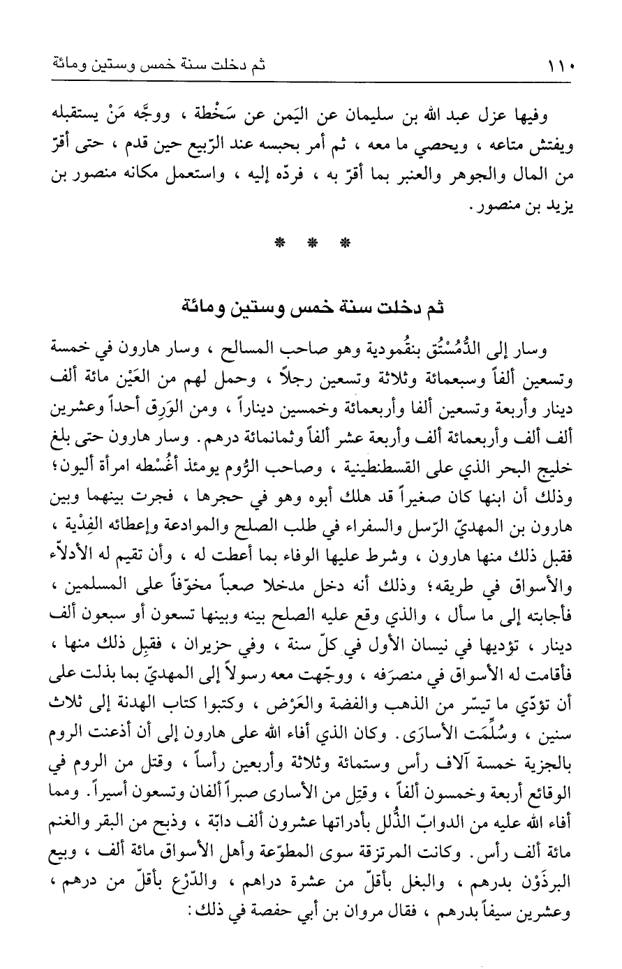 وسار إلى الدُّمُسْتُق بنقُمودية وهو صاحب المسالح، وسار هارون في خمسة وتسعين ألفًا وسبعمائة وثلاثة وتسعين رجلًا، وحمل لهم من العَيْن مائة ألف دينار وأربعة وتسعين ألفًا وأربعمائة وخمسين دينارًا، ومن الوَرِق أحدًا وعشرين ألف ألف وأربعمائة ألف وأربعة عشر ألفًا وثمانمائة درهم. وسار هارون حتَّى بلغ خليج البحر الذي على القسطنطينية، وصاحب الرُّوم يومئذٍ أغُسْطه امرأة أليون؛ وذلك أن ابنها كان صغيرًا قد هلك أبوه وهو في حجرها، فجرت بينهما وبين هارون بن المهديّ الرّسل والسفراء في طلب الصلح والموادعة وإعطائه الفِدْية، فقبل ذلك منها هارون، وشرط عليها الوفاء بما أعطت له، وأن تقيم له الأدلّاء والأسواق في طريقه؛ وذلك أنَّه دخل مدخلا صعبًا مخوّفًا على المسلمين، فأجابته إلى ما سأل، والذي وقع عليه الصلح بينه وبينها تسعون أو سبعون ألف دينار، تؤديها في نيسان الأوَّل في كلّ سنة، وفي حزيران، فقبِل ذلك منها، فأقامت له الأسواق في منصرَفه، ووجّهت معه رسولًا إلى المهديّ بما بذلت على أن تؤدّي ما تيسّر من الذَّهب والفضة والعَرْض، وكتبوا كتاب الهدنة إلى ثلاث سنين، وسُلِّمَت الأسارَى. وكان الذي أفاء الله على هارون إلى أن أذعنت الروم بالجزية خمسة آلاف رأس وستمائة وثلاثة وأربعين رأسًا، وقتل من الروم في الوقائع أربعة وخمسون ألفًا، وقتِل من الأسارى صبرًا ألفان وتسعون أسيرًا. ومما أفاء الله عليه من الدوابّ الذلل بأدراتها عشرون ألف دابّة، وذبح من البقر والغنم مائة ألف رأس. وكانت المرتزقة سوى المطوّعة وأهل الأسواق مائة ألف، وبيع البرذَوْن بدرهم، والبغل بأقلّ من عشرة دراهم، والدّرْع بأقلّ من درهم، وعشرين سيفًا بدرهم، فقال مروان بن أبي حفصة في ذلك: