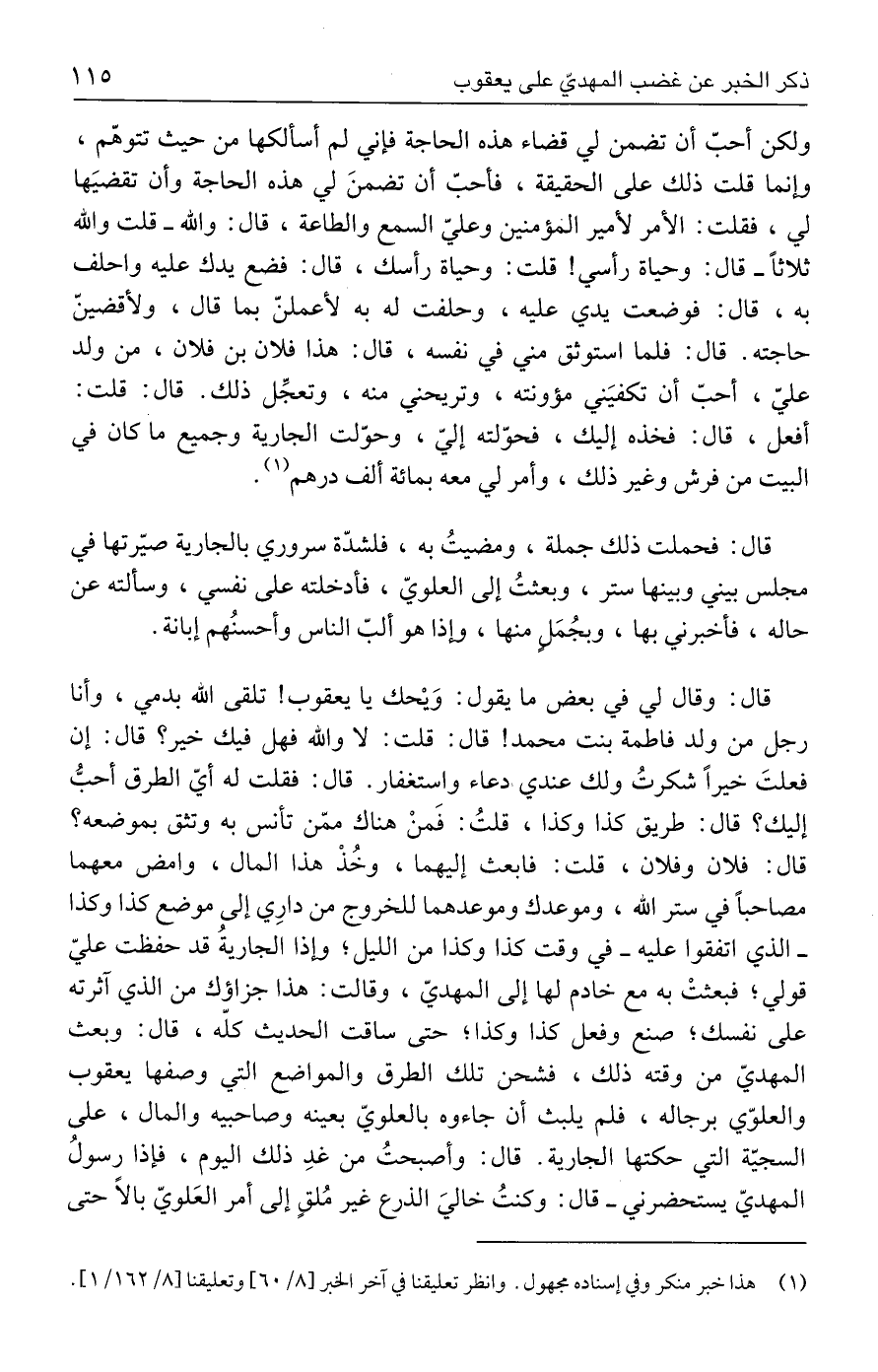 قال: وقال لي في بعض ما يقول: وَيْحك يا يعقوب! تلقى الله بدمي، وأنا رجل من ولد فاطمة بنت محمَّد! قال: قلت: لا والله فهل فيك خير؟ قال: إن فعلتَ خيرًا شكرتُ ولك عندي دعاء واستغفار. قال: فقلت له أي الطرق أحبُّ إليك؟ قال: طريق كذا وكذا، قلتُ: فَمنْ هناك ممّن تأنس به وتثق بموضعه؟ قال: فلان وفلان، قلت: فابعث إليهما، وخُذْ هذا المال، وامض معهما مصاحبًا في ستر الله، وموعدك وموعدهما للخروج من دارِي إلى موضع كذا وكذا - الذي اتفقوا عليه - في وقت كذا وكذا من الليل؛ وإذا الجاريةُ قد حفظت عليّ قولي؛ فبعثتْ به مع خادم لها إلى المهديّ، وقالت: هذا جزاؤك من الذي آثرته على نفسك؛ صنع وفعل كذا وكذا؛ حتَّى ساقت الحديث كلّه، قال: وبعث المهديّ من وقته ذلك، فشحن تلك الطرق والمواضع التي وصفها يعقوب والعلوّي برجاله، فلم يلبث أن جاءوه بالعلويّ بعينه وصاحبيه والمال، على السجيّة التي حكتها الجارية. قال: وأصبحتُ من غدِ ذلك اليوم، فإذا رسولُ المهديّ يستحضرني - قال: وكنتُ خاليَ الذرع غير مُلقٍ إلى أمر العَلويّ بالًا حتَّى