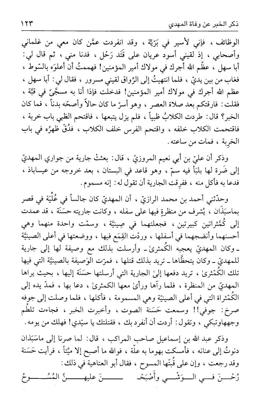 الوظائف، فإنّي لأسير في بَرّيّة، وقد انفردت عمَّن كان معي من غلماني وأصحابي، إذ لقيني أسود عريان على قَتَد رَحْل، فدنا مني، ثم قال لي: أبا سهل، عظّم الله أجرك في مولاك أمير المؤمنين! فهممتُ أن أعلوَه بالسّوط، فغاب من بين يديّ، فلما انتهيتُ إلى الرِّواق لقيني مسرور، فقال لي: أبا سهل، عظم الله أجرك في مولاك أمير المؤمنين! فدخلت فإذا أنا به مسجَّىً في قبَّة، فقلت: فارقتكم بعد صلاة العصر، وهو أسرّ ما كان حالًا وأصحّه بدنًا، فما كان الخبر؟ قال: طردت الكلابُ ظبيًا، فلم يزل يتبعها، فاقتحم الظبي باب خربة، فاقتحمت الكلاب خلفه، واقتحم الفرس خلف الكلاب، فدُقّ ظهرُه في باب الخرِبة، فمات من ساعته.