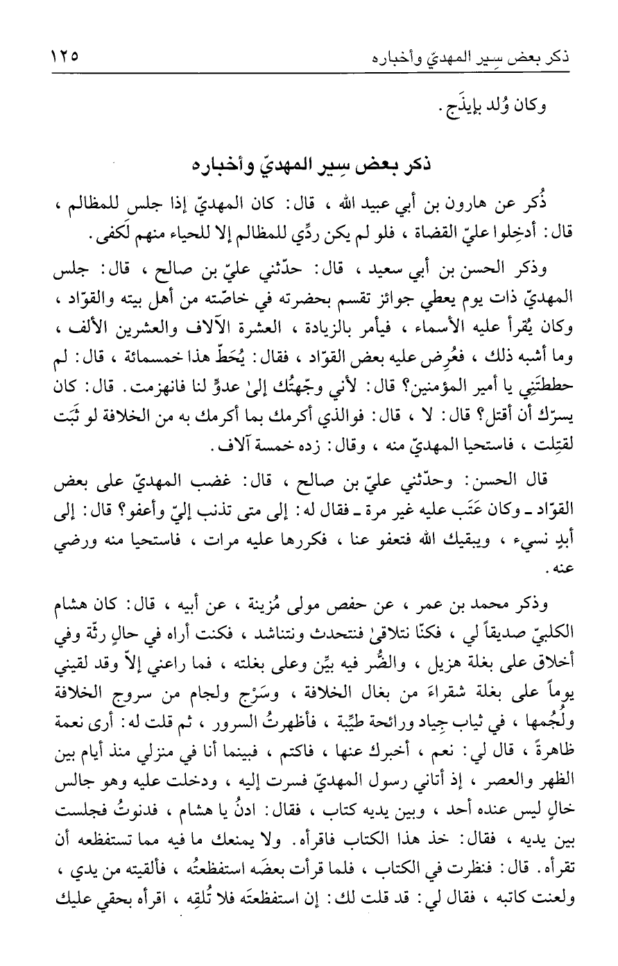 وذكر الحسن بن أبي سعيد، قال: حدّثني عليّ بن صالح، قال: جلس المهديّ ذات يوم يعطي جوائز تقسم بحضرته في خاصّته من أهل بيته والقوّاد، وكان يُقرأ عليه الأسماء، فيأمر بالزيادة، العشرة الآلاف والعشرين الألف، وما أشبه ذلك، فعُرِض عليه بعض القوّاد، فقال: يُحَطّ هذا خمسمائة، قال: لم حططتَنِي يا أمير المؤمنين؟ قال: لأني وجّهتُك إلى عدوٍّ لنا فانهزمت. قال: كان يسرّك أن أقتل؟ قال: لا، قال: فوالذي أكرمك بما أكرمك به من الخلافة لو ثَبَت لقتِلت، فاستحيا المهديّ منه، وقال: زده خمسة آلاف.