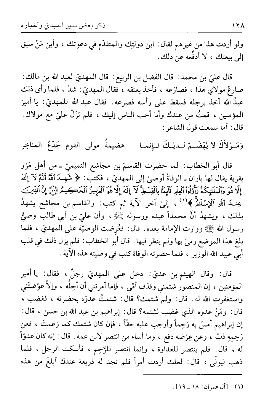 قال: وقال الهيثم بن عديّ: دخل على المهديّ رجلٌ، فقال: يا أمير المؤمنين، إن المنصور شتمني وقذف أمِّي، فإما أمرتني أن أحِلَّه، وإلّا عوّضتَني واستغفرت الله له. قال: ولم شتمك؟ قال: شتمتُ عدوّه بحضرته، فغضب، قال: ومَنْ عدوه الذي غضب لشتمه؟ قال: إبراهيم بن عبد الله بن حسن، قال: إن إبراهيم أمسّ به رَحِمًا وأوجب عليه حقًّا، فإن كان شتمك كما زعمتَ، فعن رَحِمِهِ ذبّ، وعن عِرْضه دفع، وما أساء من انتصر لابن عمه. قال: إنَّه كان عدوًّا له، قال: فلم ينتصر للعداوة، وإنَّما انتصر للرَّحِم، فأسكت الرجل، فلما ذهب ليولّى، قال: لعلك أردت أمرًا فلم تجد له ذريعة عندك أبلغَ من هذه