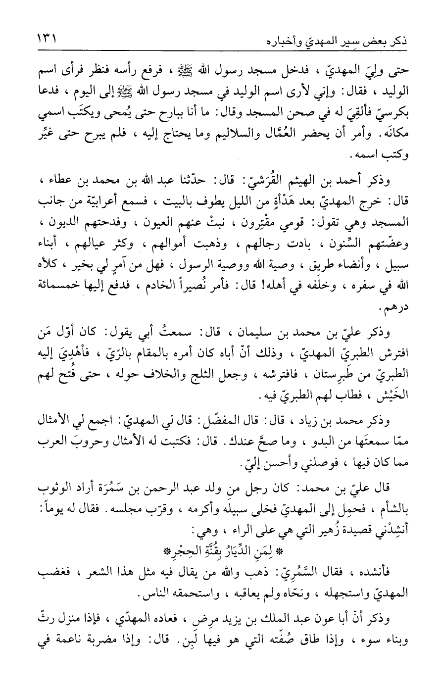 وذكر أحمد بن الهيثم القُرَشيّ: قال: حدّثنا عبد الله بن محمَّد بن عطاء، قال: خرج المهديّ بعد هَدْأةٍ من الليل يطوف بالبيت، فسمع أعرابيّة من جانب المسجد وهي تقول: قومي مقْتِرون، نبتْ عنهم العيون، وفدحتهم الديون، وعضّتهم السِّنون، بادت رجالهم، وذهبت أموالهم، وكثر عيالهم، أبناء سبيل، وأنضاء طريق، وصية الله ووصية الرسول، فهل من آمرٍ لي بخير، كلأه الله في سفره، وخلَفه في أهله! قال: فأمر نُصيرًا الخادم، فدفع إليها خمسمائة درهم.