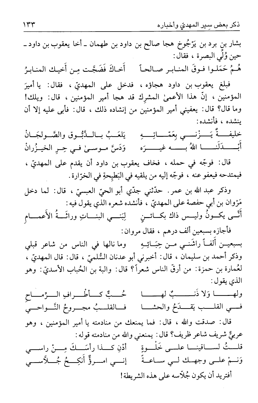 قال: صدقت والله، قال: فما يمنعك من منادمته يا أمير المؤمنين، وهو عربيٌّ شريف شاعر ظريف؟ قال: يمنعني والله من منادمته قوله: