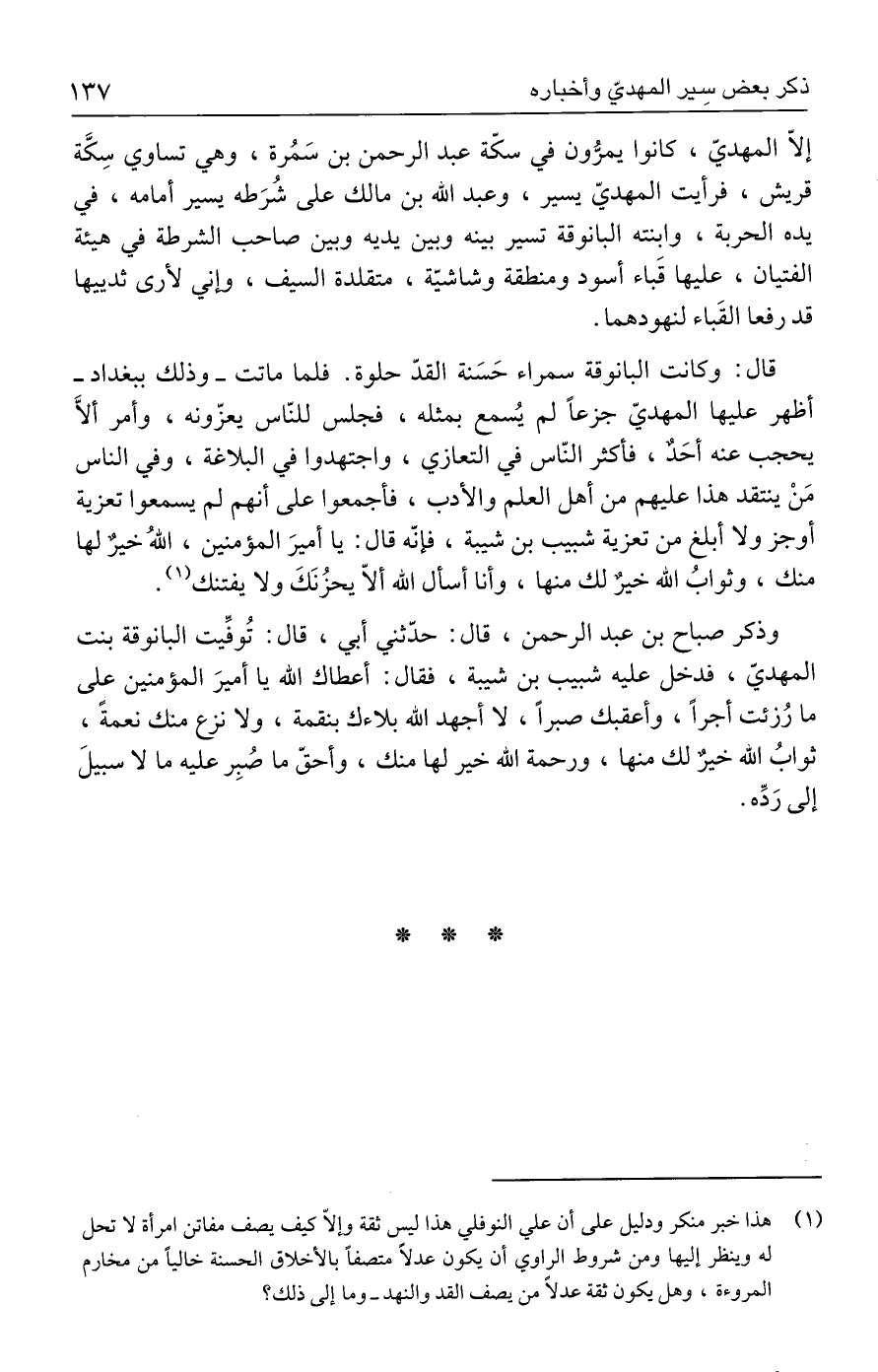 (١) هذا خبر منكر ودليل على أن علي النوفلي هذا ليس ثقة وإلّا كيف يصف مفاتن امرأة لا تحل له وينظر إليها ومن شروط الراوي أن يكون عدلًا متصفًا بالأخلاق الحسنة خاليًا من مخارم المروءة، وهل يكون ثقة عدلًا من يصف القد والنهد - وما إلى ذلك؟