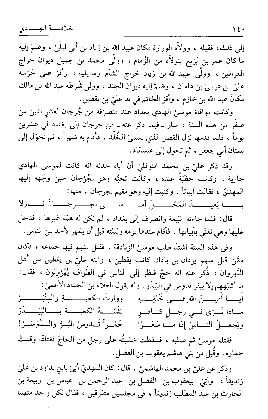 وفي هذه السنة اشتدّ طلب موسى الزنادقة، فقتل منهم فيها جماعة، فكان ممَّن قتل منهم يزدان بن باذان كاتب يقطين، وابنه عليّ بن يقطين من أهل النَّهروان، ذُكر عنه أنه حجّ فنظر إلى الناس في الطَّواف يُهَرْوِلون، فقال: ما أشبّههم إلا ببقر تدوس في البَيْدَر. وله يقول العلاء بن الحداد الأعمى: