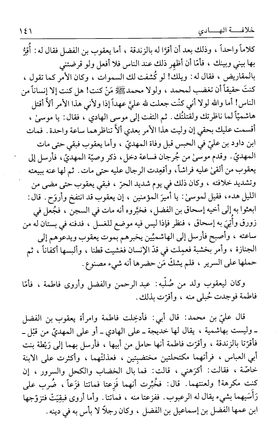 كلامًا واحدًا، وذلك بعد أن أقرَّا له بالزندقة، أما يعقوب بن الفضل فقال له: أُقِرُّ بها بيني وبينك، فأمّا أن أظهِر ذلك عند الناس فلا أفعل ولو قرضتني بالمقاريض، فقال له: ويلك! لو كُشفت لك السموات، وكان الأمر كما تقول، كنتَ حقيقًا أن تغضب لمحمد، ولولا محمد - صلى الله عليه وسلم - مَنْ كنت! هل كنت إلا إنسانًا من الناس! أما والله لولا أني كنْت جعلت لله عليَّ عهدًا إذا ولأني هذا الأمر ألَّا أقتل هاشميًّا لما ناظرتك ولقتلتُك. ثم التفت إلى موسى الهادي، فقال: يا موسى، أقسمت عليك بحقي إن وليت هذا الأمر بعدي ألَّا تناظرهما ساعة واحدة. فمات ابن داود بن عليّ في الحبس قبل وفاة المهديّ، وأما يعقوب فبقي حتى مات المهديّ. وقدم موسى من جُرجان فساعة دخل، ذكر وصيّة المهديّ، فأرسل إلى يعقوب من ألقى عليه فراشًا، وأقعِدت الرجال عليه حتى مات. ثم لها عنه ببيعته وتشديد خلافته، وكان ذلك في يوم شديد الحرّ، فبقي يعقوب حتى مضى من الليل هدء، فقيل لموسى: يا أميرَ المؤمنين، إن يعقوب قد انتفخ وأروَح. قال: ابعثوا به إلى أخيه إسحاق بن الفضل، فخبَّروه أنه مات في السجن، فجُعل في زورق وأُتِيَ به إسحاق، فنظر فإذا ليس فيه موضع للغسل، فدفنه في بستان له من ساعته، وأصبح فأرسل إلى الهاشميِّين يخبرهم بموت يعقوب ويدعوهم إلى الجنازة، وأمر بخشبة فعمِلت في قدّ الإنسان فغشيت قطنا، وألبسها أكفانًا، ثم حملها على السرير، فلم يشكّ مَن حضرها أنه شيء مصنوع.