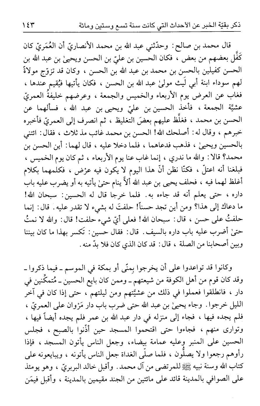 وكانوا قد تواعدوا على أن يخرجوا بِمنًى أو بمكة في الموسم - فيما ذكروا - وقد كان قوم من أهل الكوفة من شيعتهم - وممن كان بايع الحسين - مُتمكِّنين في دار، فانطلقوا فعملوا في ذلك من عشيَّتهم ومن ليلتهم، حتى إذا كان في آخر الليل خرجوا. وجاء يحيى بن عبد الله حتى ضرب باب دار مَرْوان على العمريّ، فلم يجده فيها، فجاء إلى منزله في دار عبد الله بن عمر فلم يجده أيضًا فيها، وتوارى منهم، فجاءوا حتى اقتحموا المسجد حين أذّنوا بالصبح، فجلس الحسين على المنبر وعليه عمامة بيضاء، وجعل الناس يأتون المسجد، فإذا رأوهم رجعوا ولا يصلُّون، فلما صلّى الغداة جعل الناس يأتونه، ويبايعونه على كتاب الله وسنة نبيه - صلى الله عليه وسلم - للمرتضى من آل محمد. وأقبل خالد البربريّ، وهو يومئذ على الصوافي بالمدينة قائد على مائتين من الجند مقيمين بالمدينة، وأقبل فيمَن