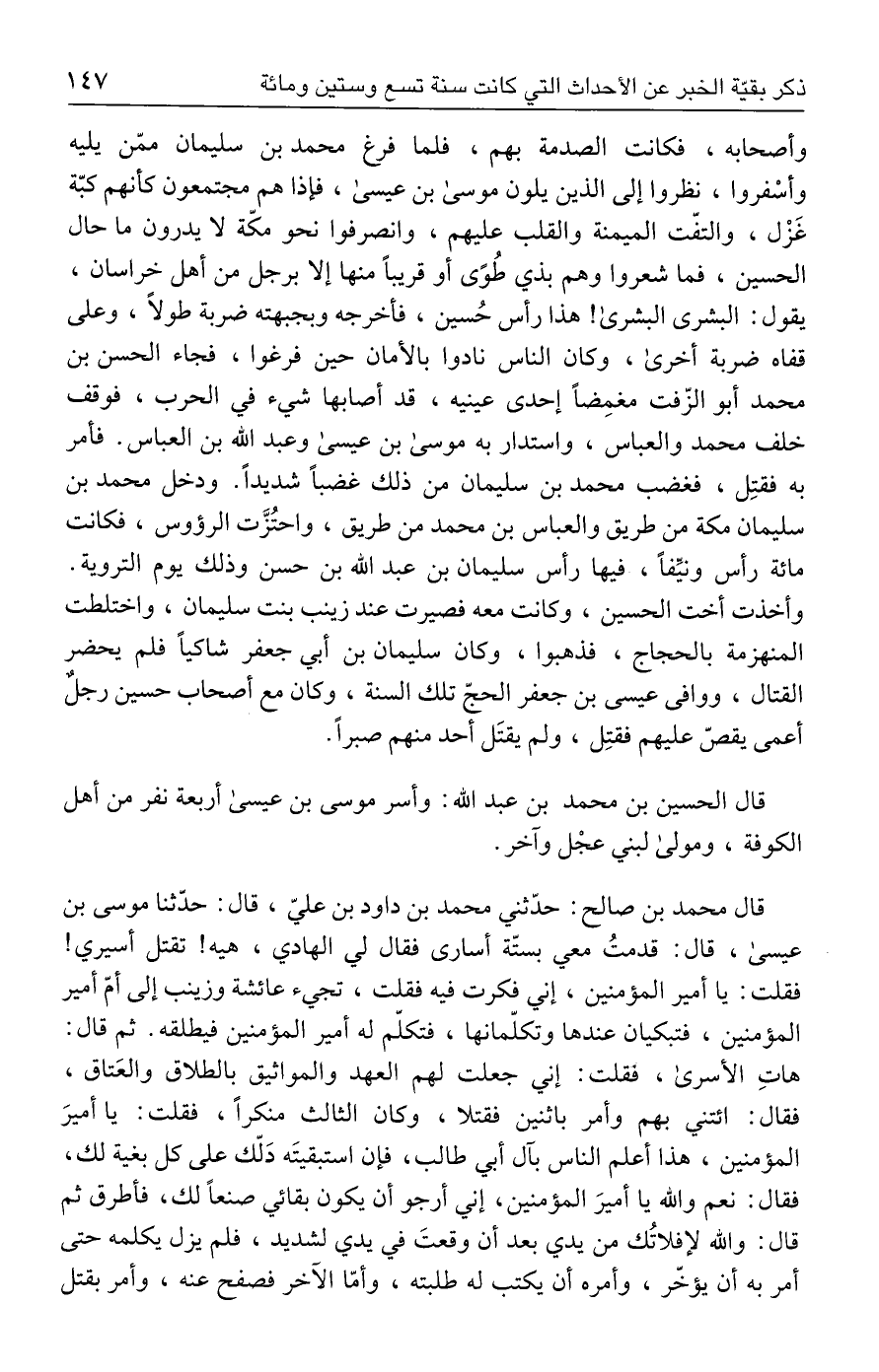 قال الحسين بن محمد بن عبد الله: وأسر موسى بن عيسى أربعة نفر من أهل الكوفة، ومولى لبني عجْل وآخر.