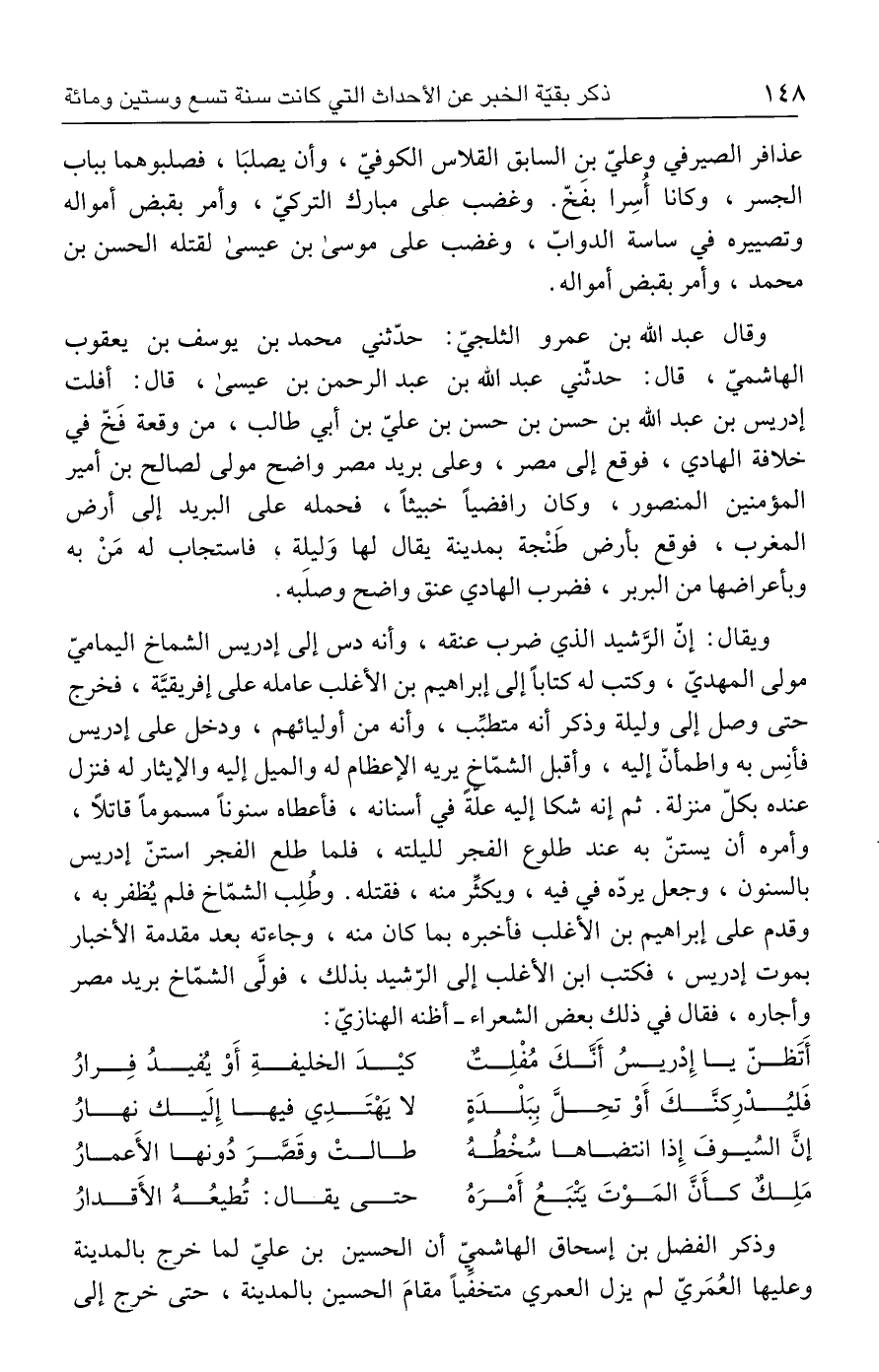 وقال عبد الله بن عمرو الثلجيّ: حدّثني محمد بن يوسف بن يعقوب الهاشميّ، قال: حدثّني عبد الله بن عبد الرحمن بن عيسى، قال: أفلت إدريس بن عبد الله بن حسن بن حسن بن عليّ بن أبي طالب، من وقعة فَخّ في خلافة الهادي، فوقع إلى مصر، وعلى بريد مصر واضح مولى لصالح بن أمير المؤمنين المنصور، وكان رافضيًا خبيثًا، فحمله على البريد إلى أرض المغرب، فوقع بأرض طَنْجة بمدينة يقال لها وَليلة، فاستجاب له مَنْ به وبأعراضها من البربر، فضرب الهادي عنق واضح وصلَبه.