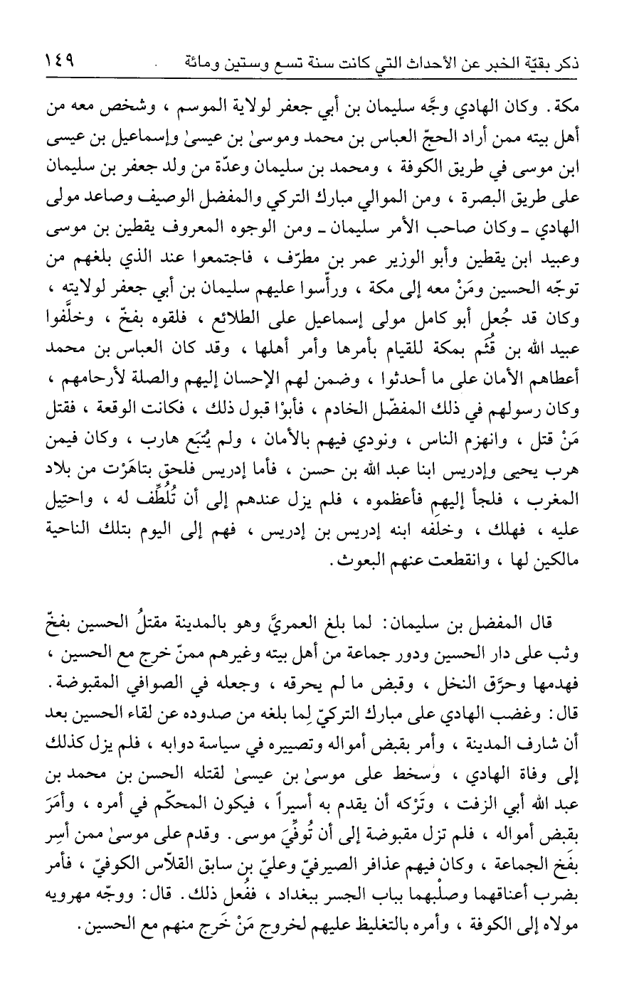مكة. وكان الهادي وجَّه سليمان بن أبي جعفر لولاية الموسم، وشخص معه من أهل بيته ممن أراد الحجّ العباس بن محمد وموسى بن عيسى وإسماعيل بن عيسى بن موسى في طريق الكوفة، ومحمد بن سليمان وعدّة من ولد جعفر بن سليمان على طريق البصرة، ومن الموالي مبارك التركي والمفضل الوصيف وصاعد مولى الهادي - وكان صاحب الأمر سليمان - ومن الوجوه المعروف يقطين بن موسى وعبيد بن يقطين وأبو الوزير عمر بن مطرّف، فاجتمعوا عند الذي بلغهم من توجّه الحسين ومَنْ معه إلى مكة، ورأسوا عليهم سليمان بن أبي جعفر لولايته، وكان قد جُعل أبو كامل مولى إسماعيل على الطلائع، فلقوه بفخّ، وخلَّفوا عبيد الله بن قُثَم بمكة للقيام بأمرها وأمر أهلها، وقد كان العباس بن محمد أعطاهم الأمان على ما أحدثوا، وضمن لهم الإحسان إليهم والصلة لأرحامهم، وكان رسولهم في ذلك المفضّل الخادم، فأبوْا قبول ذلك، فكانت الوقعة، فقتل مَنْ قتل، وانهزم الناس، ونودي فيهم بالأمان، ولم يُتبَع هارب، وكان فيمن هرب يحيى وإدريس ابنا عبد الله بن حسن، فأما إدريس فلحق بتاهَرْت من بلاد المغرب، فلجأ إليهم فأعظموه، فلم يزل عندهم إلى أن تُلُطِّف له، واحتِيل عليه، فهلك، وخلفه ابنه إدريس بن إدريس، فهم إلى اليوم بتلك الناحية مالكين لها، وانقطعت عنهم البعوث.