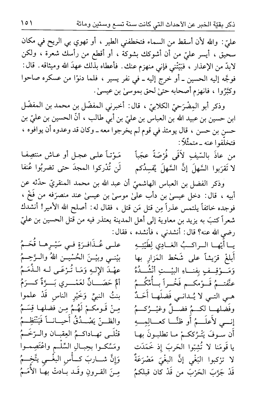 عليّ: والله لأن أسقط من السماء فتخطفني الطير، أو تهوي بي الريح في مكان سحيق، أيسر عليّ من أن أشوكك بشوكة، أو أقطع من رأسك شعرة، ولكن لابدّ من الإعذار، فبَيّتْني فإني منهزم عنك. فأعطاه بذلك عهدَ الله وميثاقه. قال: فوجَّه إليه الحسين - أو خرج إليه - في نفر يسير، فلما دنوْا من عسكره صاحوا وكبَّرُوا، فانهزم أصحابه حتى لحق بموسى بن عيسى.