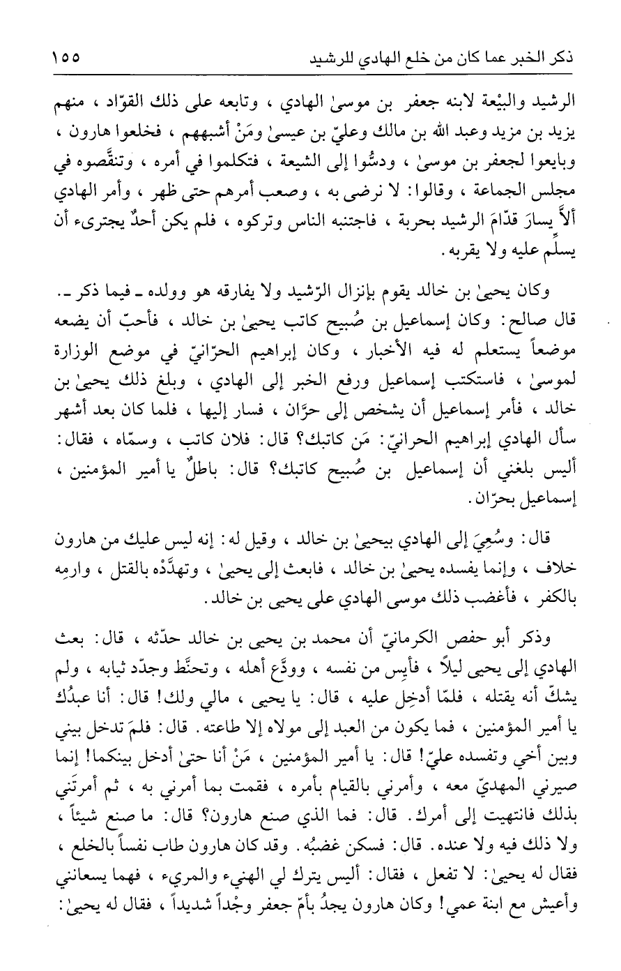 الرشيد والبيْعة لابنه جعفر بن موسى الهادي، وتابعه على ذلك القوّاد، منهم يزيد بن مزيد وعبد الله بن مالك وعليّ بن عيسى ومَنْ أشبههم، فخلعوا هارون، وبايعوا لجعفر بن موسى، ودسُّوا إلى الشيعة، فتكلموا في أمره، وتنقَّصوه في مجلس الجماعة، وقالوا: لا نرضى به، وصعب أمرهم حتى ظهر، وأمر الهادي ألَّا يسارَ قدّامَ الرشيد بحربة، فاجتنبه الناس وتركوه، فلم يكن أحدٌ يجترئ أن يسلِّم عليه ولا يقربه.