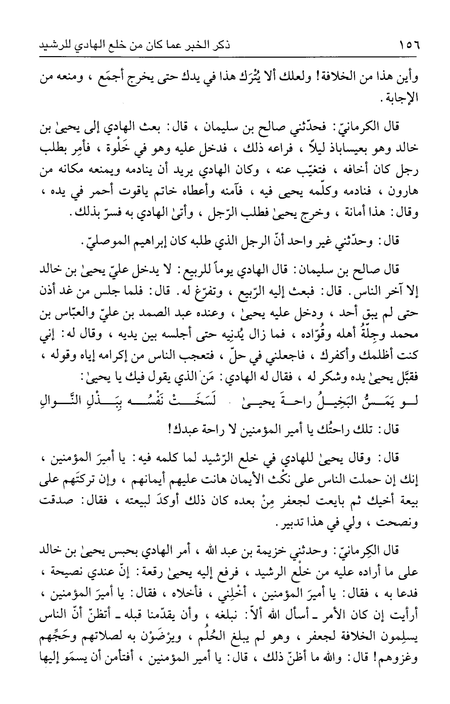 قال الكِرمانيّ: وحدثني خزيمة بن عبد الله، أمر الهادي بحبس يحيى بن خالد على ما أراده عليه من خلْع الرشيد، فرفع إليه يحيى رقعة: إنّ عندي نصيحة، فدعا به، فقال: يا أميرَ المؤمنين، أخْلِني، فأخلاه، فقال: يا أميرَ المؤمنين، أرأيت إن كان الأمر - أسأل الله ألّا: نبلغه، وأن يقدّمنا قبله - أتظنّ أنّ الناس يسلِمون الخلافة لجعفر، وهو لم يبلغ الحُلُم، ويرْضَوْن به لصلاتهم وحَجِّهم وغزوهم! قال: والله ما أظنّ ذلك، قال: يا أمير المؤمنين، أفتأمن أن يسمَو إليها