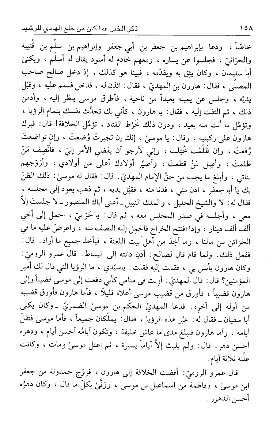 خاصًّا، ودعا بإبراهيم بن جعفر بن أبي جعفر وإبراهيم بن سلْم بن قُتيبة والحرّانيّ، فجلسوا عن يساره، ومعهم خادم له أسود يقال له أسلَم، ويكنى أبا سليمان، وكان يثِق به ويقدّمه، فبينا هو كذلك، إذ دخل صالح صاحب المصلّى، فقال: هارون بن المهديّ، فقال: ائذن له، فدخل فسلم عليه، وقبّل يديْه، وجلس عن يمينه بعيدًا من ناحية، فأطرق موسى ينظر إليه، وأدمن ذلك، ثم التفت إليه، فقال: يا هارون، كأني بك تحدِّث نفسك بتمام الرؤيا، وتؤمِّل ما أنت منه بعيد، ودون ذلك خَرْط القتاد، تؤمِّل الخلافة! قال: فبرك هارون على ركبتيه، وقال: يا موسى، إنك إن تجبرتَ وُضعتَ، وإن تواضعتَ رُفعتَ، وإن ظَلَمْت خُتِلت، وإني لأرجو أن يفضي الأمر إليّ، فأُنْصِف مَنْ ظلمتَ، وأصِل مَنْ قطعتَ، وأصيِّر أولادك أعلى من أولادي، وأزوّجهم بناتي، وأبلغ ما يجب من حقّ الإِمام المهديّ. قال: فقال له موسى: ذلك الظنّ بك يا أبا جعفر، ادن مني، فدنا منه، فقبَّل يديه، ثم ذهب يعود إلى مجلسه، فقال له: لا والشيخ الجليل، والملك النبيل - أعني أباك المنصور - لا جلستَ إلّا معي، وأجلسه في صدر المجلس معه، ثم قال: يا حَرّانيّ، احمل إلى أخي ألف ألف دينار، وإذا افتتح الخراج فاحْمِل إليه النصف منه، واعرضْ عليه ما في الخزائن من مالنا، وما أخِذ من أهل ابيت اللعنة، فيأخذ جميع ما أراد. قال: ففعل ذلك. ولما قام قال لصالح: أدنِ دابته إلى البساط. قال عمرو الروميّ: وكان هارون يأنس بي، فقمت إليه فقلت: ياسيّدي، ما الرؤيا التي قال لك أمير المؤمنين؟ قال: قال المهديّ: أرِيت في منامي كأني دفعت إلى موسى قضيبًا وإلى هارون قضيبًا، فأورق من قضيب موسى أعلاه قليلًا، فأما هارون فأورق قضيبه من أوله إلى آخرِه. فدعا المهديّ الحكَم بن موسى الضمريّ - وكان يكنى أبا سفيان - فقال له: عبِّر هذه الرؤيا، فقال: يملّكان جميعًا، فأما موسى فتقلّ أيامه، وأما هارون فيبلغ مدى ما عاش خليفة، وتكون أيامُه أحسن أيام، ودهره أحسن دهر. قال: ولم يلبث إلَّا أيامًا يسيرة، ثم اعتل موسى ومات، وكانت علّته ثلاثة أيام.