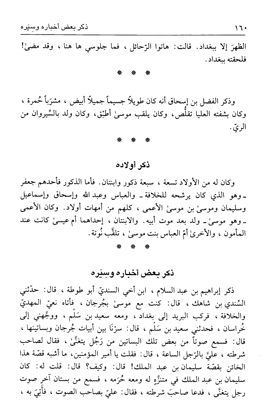 ذكر إبراهيم بن عبد السلام، ابن أخي السنديّ أبو طوطة، قال: حدّثني السِّندي بن شاهك، قال: كنت مع موسى بجُرجان، فأتاه نعيّ المهديّ والخلافة، فركب البريد إلى بغداد، ومعه سعيد بن سَلْم، ووجَّهني إلى خُراسان، فحدثني سعيد بن سَلْم، قال: سرْنَا بين أبيات جُرجان وبساتينها، قال: فسمع صوتًا من بعض تلك البساتين من رَجُل يتغنَّى، فقال لصاحب شرطته، عليَّ بالرّجل الساعة، قال: فقلت يا أمير المؤمنين، ما أشبه قصّة هذا الخائن بقصّة سليمان بن عبد الملك! قال: وكيف؟ قال: قلت له: كان سليمان بن عبد الملك في متنزَّهٍ له ومعه حُرَمه، فسمع من بستان آخر صوت رجل يتغنَّى، فدعا صاحبَ شرطته، فقال: عليّ بصاحب الصوت، فأَتِيَ به،