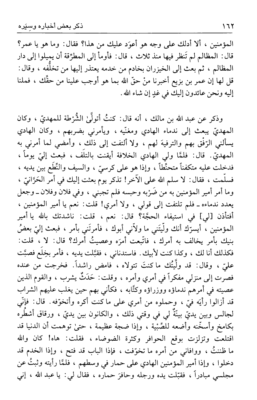 وذكر عن عبد الله بن مالك، أنه قال: كنتُ أتولَّى الشُّرْطة للمهديّ، وكان المهديّ يبعث إلى ندماء الهادي ومغنّيه، ويأمرني بضربهم، وكان الهادي يسألني الرّفْق بهم والترفيةَ لهم، ولا ألتفت إلى ذلك، وأمضي لما أمرني به المهديّ. قال: فلمَّا ولي الهادي الخلافة أيقنت بالتلَف، فبعث إليّ يومًا، فدخلت عليه متكفنًا متحنِّطًا، وإذا هو على كرسيّ، والسيف والنِّطَع بين يديه، فسلّمت، فقال: لا سلم الله على الآخر! تذكر يوم بعثت إليك في أمر الحَرَّانيّ، وما أمر أمير المؤمنين به من ضَرْبه وحبسه فلم تجبني، وفي فلان وفلان - وجعل يعدد ندماءه - فلم تلتفت إلى قولي، ولا أمري! قلت: نعم يا أمير المؤمنين، أفتأذن [لي] في استيفاء الحجَّة؟ قال: نعم، قلت: ناشدتك بالله يا أمير المؤمنين، أيسرّك أنك ولّيتَني ما ولّاني أبوك، فأمرتَني بأمر، فبعث إليّ بعضُ بنيك بأمر يخالف به أمرك، فاتّبعت أمرَه وعصيتُ أمرك؟ قال: لا، قلت: فكذلك أنا لك، وكذا كنت لأبيك. فاستدناني، فقبَّلت يديه، فأمر بخِلَع فصبَّت عليّ، وقال: قد ولَّيتُك ما كنتَ تتولاه، فامض راشدًا. فخرجت من عنده فصرت إلى منزلي مفكرًا في أمري وأمره، وقلت: حَدَثٌ يشرب، والقوم الذين عصيته في أمرهم ندماؤه ووزراؤه وكتَّابه، فكأني بهم حين يغلب عليهم الشراب قد أزالوا رأيَه فيّ، وحملوه من أمري على ما كنت أكره وأتخوّفه. قال: فإنّي لجالس وبين يديّ بينّةٌ لي في وقتي ذلك، والكانون بين يديّ، ورقاق أشطُره بكامخ وأسخّنه وأضعه للصِّبْية، وإذا ضجة عظيمة، حتى توهمت أن الدنيا قد اقتلعت وتزلزت بوقع الحوافر وكثرة الضوضاء، فقلت: هاه! كان والله ما ظننتُ، ووافاني من أمره ما تخوّفت، فإذا الباب قد فتح، وإذا الخدم قد دخلوا، وإذا أمير المؤمنين الهادي على حمار في وسطهم، فلمَّا رأيته وثبتُ عن مجلسي مبادرًا، فقبّلت يده ورجله وحافرَ حماره، فقال لي: يا عبد الله، إني