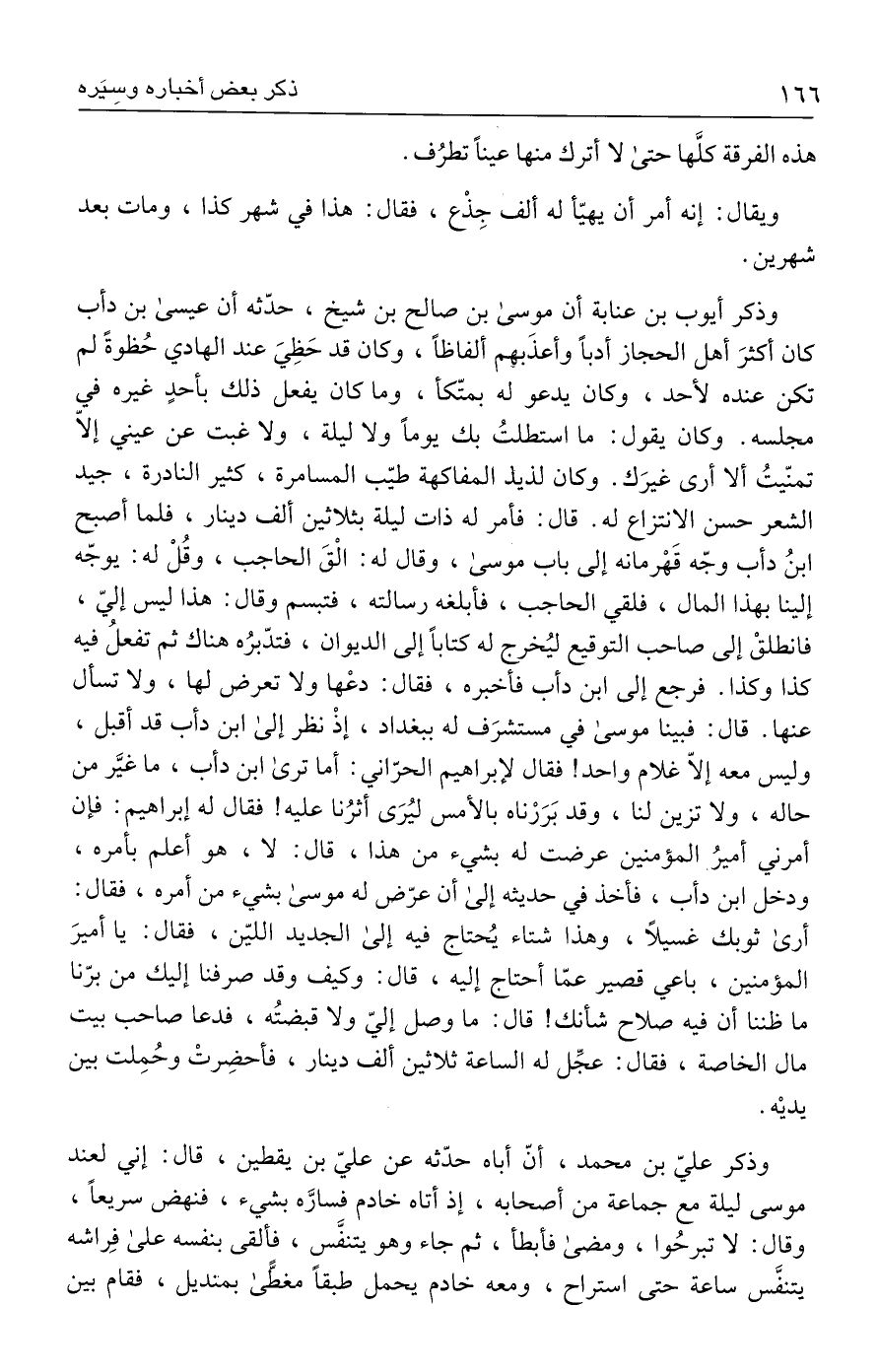 وذكر أيوب بن عنابة أن موسى بن صالح بن شيخ، حدّثه أن عيسى بن دأب كان أكثرَ أهل الحجاز أدبًا وأعذَبهم ألفاظًا، وكان قد حَظِيَ عند الهادي حُظوةً لم تكن عنده لأحد، وكان يدعو له بمتّكأ، وما كان يفعل ذلك بأحدٍ غيره في مجلسه. وكان يقول: ما استطلتُ بك يومًا ولا ليلة، ولا غبت عن عيني إلّا تمنّيتُ ألا أرى غيرَك. وكان لذيد المفاكهة طيّب المسامرة، كثير النادرة، جيد الشعر حسن الانتزاع له. قال: فأمر له ذات ليلة بثلاثين ألف دينار، فلما أصبح ابنُ دأب وجّه قَهْرمانه إلى باب موسى، وقال له: الْقَ الحاجب، وقُلْ له: يوجّه إلينا بهذا المال، فلقي الحاجب، فأبلغه رسالته، فتبسم وقال: هذا ليس إليّ، فانطلقْ إلى صاحب التوقيع ليُخرج له كتابًا إلى الديوان، فتدّبرُه هناك ثم تفعلُ فيه كذا وكذا. فرجع إلى ابن دأب فأخبره، فقال: دعْها ولا تعرض لها، ولا تسأل عنها. قال: فبينا موسى في مستشرَف له ببغداد، إذْ نظر إلى ابن دأب قد أقبل، وليس معه إلّا غلام واحد! فقال لإبراهيم الحرّاني: أما ترى ابن دأب، ما غيَّر من حاله، ولا تزين لنا، وقد بَرَرْناه بالأمس ليُرَى أثرُنا عليه! فقال له إبراهيم: فإن أمرني أميرُ المؤمنين عرضت له بشيء من هذا، قال: لا، هو أعلم بأمره، ودخل ابن دأب، فأخذ في حديثه إلى أن عرّض له موسى بشيء من أمره، فقال: أرى ثوبك غسيلًا، وهذا شتاء يُحتاج فيه إلى الجديد الليّن، فقال: يا أميرَ المؤمنين، باعي قصير عمّا أحتاج إليه، قال: وكيف وقد صرفنا إليك من برّنا ما ظننا أن فيه صلاح شأنك! قال: ما وصل إليّ ولا قبضتُه، فدعا صاحب بيت مال الخاصة، فقال: عجِّل له الساعة ثلاثين ألف دينار، فأحضِرتْ وحُمِلت بين يديْه.