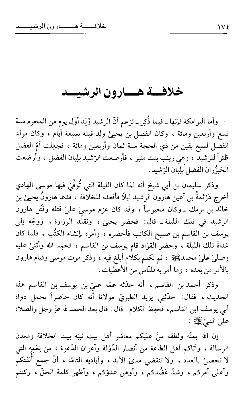 إن الله بمنِّه ولطفه منَّ عليكم معاشر أهل بيت نبيّه بيت الخلافة ومعدن الرسالة، وآتاكم أهل الطاعة من أنصار الدّوْلة وأعوان الدّعوة، من نِعَمِهِ التي لا تحصى بالعدد، ولا تنقضي مدى الأبد، وأياديه التافة، أنْ جمع أُلفتكم وأعلى أمركم، وشدّ عَضُدكم، وأوهن عدوّكم، وأظهر كلمة الحقّ، وكنتم