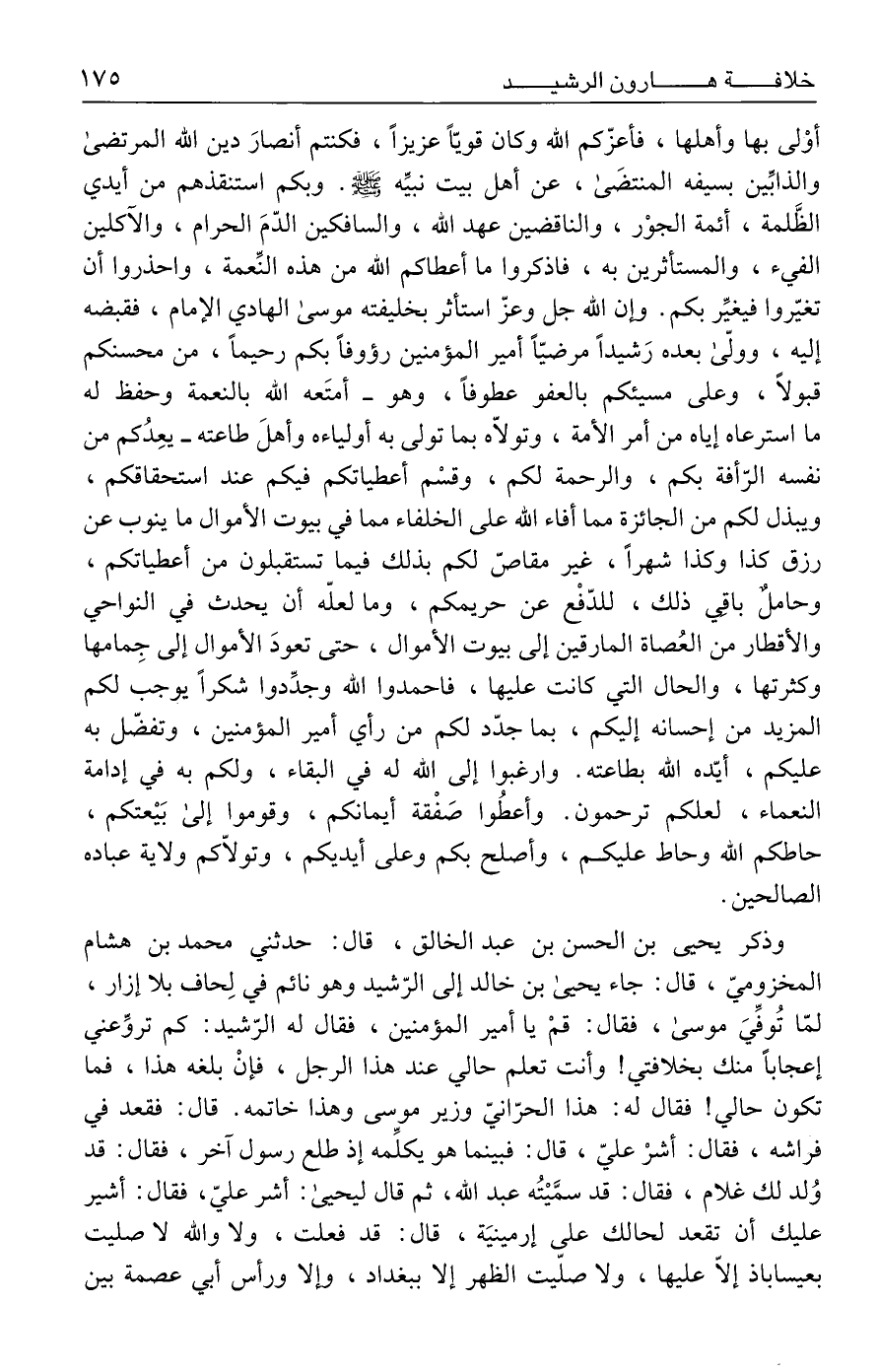 أوْلى بها وأهلها، فأعزّكم الله وكان قويًّا عزيزًا، فكنتم أنصارَ دين الله المرتضى والذابِّين بسيفه المنتضَى، عن أهل بيت نبيِّه - صلى الله عليه وسلم -. وبكم استنقذهم من أيدي الظَّلمة، أئمة الجوْر، والناقضين عهد الله، والسافكين الدّمَ الحرام، والآكلين الفيء، والمستأثرين به، فاذكروا ما أعطاكم الله من هذه النِّعمة، واحذروا أن تغيّروا فيغيِّر بكم. وإن الله جل وعزّ استأثر بخليفته موسى الهادي الإمام، فقبضه إليه، وولّى بعده رَشيدًا مَرضيًّا أمير المؤمنين رؤوفًا بكم رحيمًا، من محسنكم قبولًا، وعلى مسيئكم بالعفو عطوفًا، وهو - أمتَعه الله بالنعمة وحفظ له ما استرعاه إياه من أمر الأمة، وتولّاه بما تولى به أولياءه وأهلَ طاعته - يعِدُكم من نفسه الرّأفة بكم، والرحمة لكم، وقسْم أعطياتكم فيكم عند استحقاقكم، ويبذل لكم من الجائزة مما أفاء الله على الخلفاء مما في بيوت الأموال ما ينوب عن رزق كذا وكذا شهرًا، غير مقاصّ لكم بذلك فيما تستقبلون من أعطياتكم، وحاملٌ باقي ذلك، للدّفْع عن حريمكم، وما لعلّه أن يحدث في النواحي والأقطار من العُصاة المارقين إلى بيوت الأموال، حتى تعودَ الأموال إلى جِمامها وكثرتها، والحال التي كانت عليها، فاحمدوا الله وجدِّدوا شكرًا يوجب لكم المزيد من إحسانه إليكم، بما جدّد لكم من رأي أمير المؤمنين، وتفضّل به عليكم، أيّده الله بطاعته. وارغبوا إلى الله له في البقاء، ولكم به في إدامة النعماء، لعلكم ترحمون. وأعطُوا صَفْقة أيمانكم، وقوموا إلى بَيْعتكم، حاطكم الله وحاط عليكم، وأصلح بكم وعلى أيديكم، وتولّاكم ولاية عباده الصالحين.