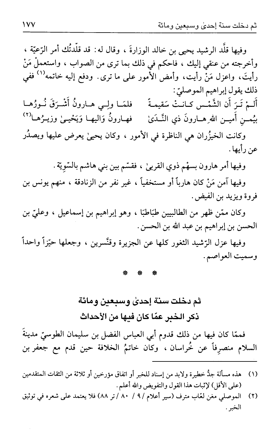 (٢) الموصلي مغن لعّاب مترف (سير أعلام/ ٩/ ٨٠/ تر ٨٨) فلا يعتمد على شعره في توثيق الخبر.