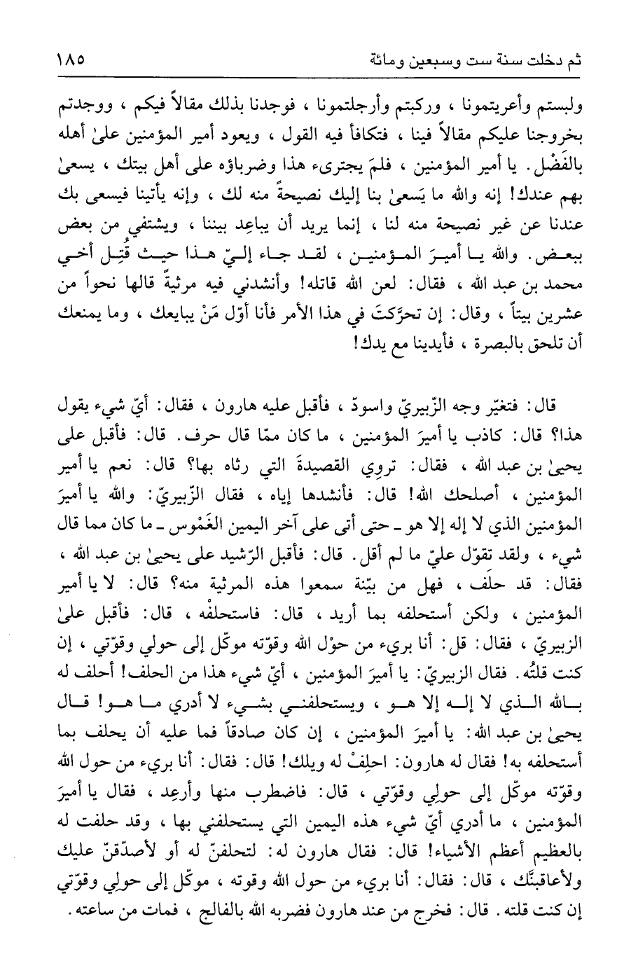 قال: فتغيّر وجه الزّبيريّ واسودّ، فأقبل عليه هارون، فقال: أيّ شيء يقول هذا؟ قال: كاذب يا أميرَ المؤمنين، ما كان ممّا قال حرف. قال: فأقبل على يحيى بن عبد الله، فقال: تروِي القصيدةَ التي رثاه بها؟ قال: نعم يا أمير المؤمنين، أصلحك الله! قال: فأنشدها إياه، فقال الزّبيريّ: والله يا أميرَ المؤمنين الذي لا إله إلا هو - حتى أتى على آخر اليمين الغَمْوس - ما كان مما قال شيء، ولقد تقوّل عليّ ما لم أقل. قال: فأقبل الرّشيد على يحيى بن عبد الله، فقال: قد حلَف، فهل من بيّنة سمعوا هذه المرثية منه؟ قال: لا يا أمير المؤمنين، ولكن أستحلفه بما أريد، قال: فاستحلفْه، قال: فأقبل على الزبيريّ، فقال: قل: أنا بريء من حوْل الله وقوّته موكّل إلى حولي وقوّتي، إن كنت قلتُه. فقال الزبيريّ: يا أميرَ المؤمنين، أيّ شيء هذا من الحلف! أحلف له بالله الذي لا إله إلا هو، ويستحلفني بشيء لا أدري ما هو! قال يحيى بن عبد الله: يا أميرَ المؤمنين، إن كان صادقًا فما عليه أن يحلف بما أستحلفه به! فقال له هارون: احلِفْ له ويلك! قال: فقال: أنا بريء من حول الله وقوّته موكّل إلى حولي وقوّتي، قال: فاضطرب منها وأرعِد، فقال يا أميرَ المؤمنين، ما أدري أيّ شيء هذه اليمين التي يستحلفني بها، وقد حلفت له بالعظيم أعظم الأشياء! قال: فقال هارون له: لتحلفنّ له أو لأصدّقنّ عليك ولأعاقبنَّك، قال: فقال: أنا بريء من حول الله وقوته، موكّل إلى حولي وقوّتي إن كنت قلته. قال: فخرج من عند هارون فضربه الله بالفالج، فمات من ساعته.