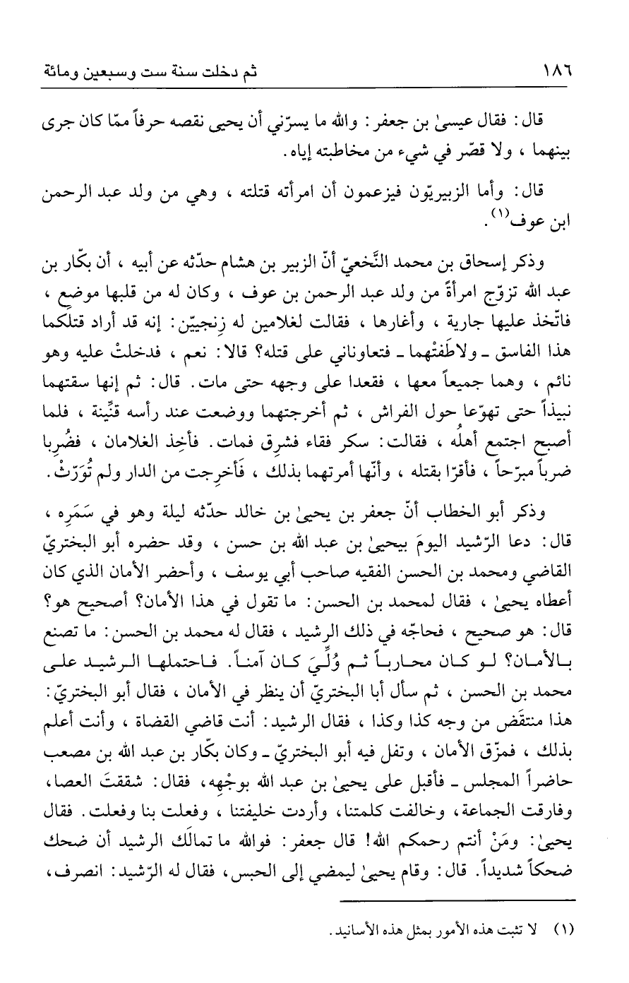 وذكر أبو الخطاب أنّ جعفر بن يحيى بن خالد حدّثه ليلة وهو في سَمَرِه، قال: دعا الرّشيد اليومَ بيحيى بن عبد الله بن حسن، وقد حضره أبو البختريّ القاضي ومحمد بن الحسن الفقيه صاحب أبي يوسف، وأحضر الأمان الذي كان أعطاه يحيى، فقال لمحمد بن الحسن: ما تقول في هذا الأمان؟ أصحيح هو؟ قال: هو صحيح، فحاجّه في ذلك الرشيد، فقال له محمد بن الحسن: ما تصنع بالأمان؟ لو كان محاربًا ثم وُلِّيَ كان آمنًا. فاحتملها الرشيد على محمد بن الحسن، ثم سأل أبا البختريّ أن ينظر في الأمان، فقال أبو البختريّ: هذا منتقَض من وجه كذا وكذا، فقال الرشيد: أنت قاضي القضاة، وأنت أعلم بذلك، فمزّق الأمان، وتفل فيه أبو البختريّ - وكان بكّار بن عبد الله بن مصعب حاضرًا المجلس - فأقبل على يحيى بن عبد الله بوجْهِه، فقال: شققتَ العصا، وفارقت الجماعة، وخالفت كلمتنا، وأردت خليفتنا، وفعلت بنا وفعلت. فقال يحيى: ومَنْ أنتم رحمكم الله! قال جعفر: فوالله ما تمالَك الرشيد أن ضحك ضحكًا شديدًا. قال: وقام يحيى ليمضي إلى الحبس، فقال له الرّشيد: انصرف،