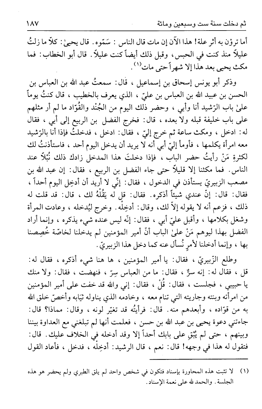 (١) لا تثبت هذه المحاورة بإسناد فتكون في شخص واحد لم يلق الطبري ولم يحضر هو هذه الجلسة. والحمد لله على نعمة الإسناد.
