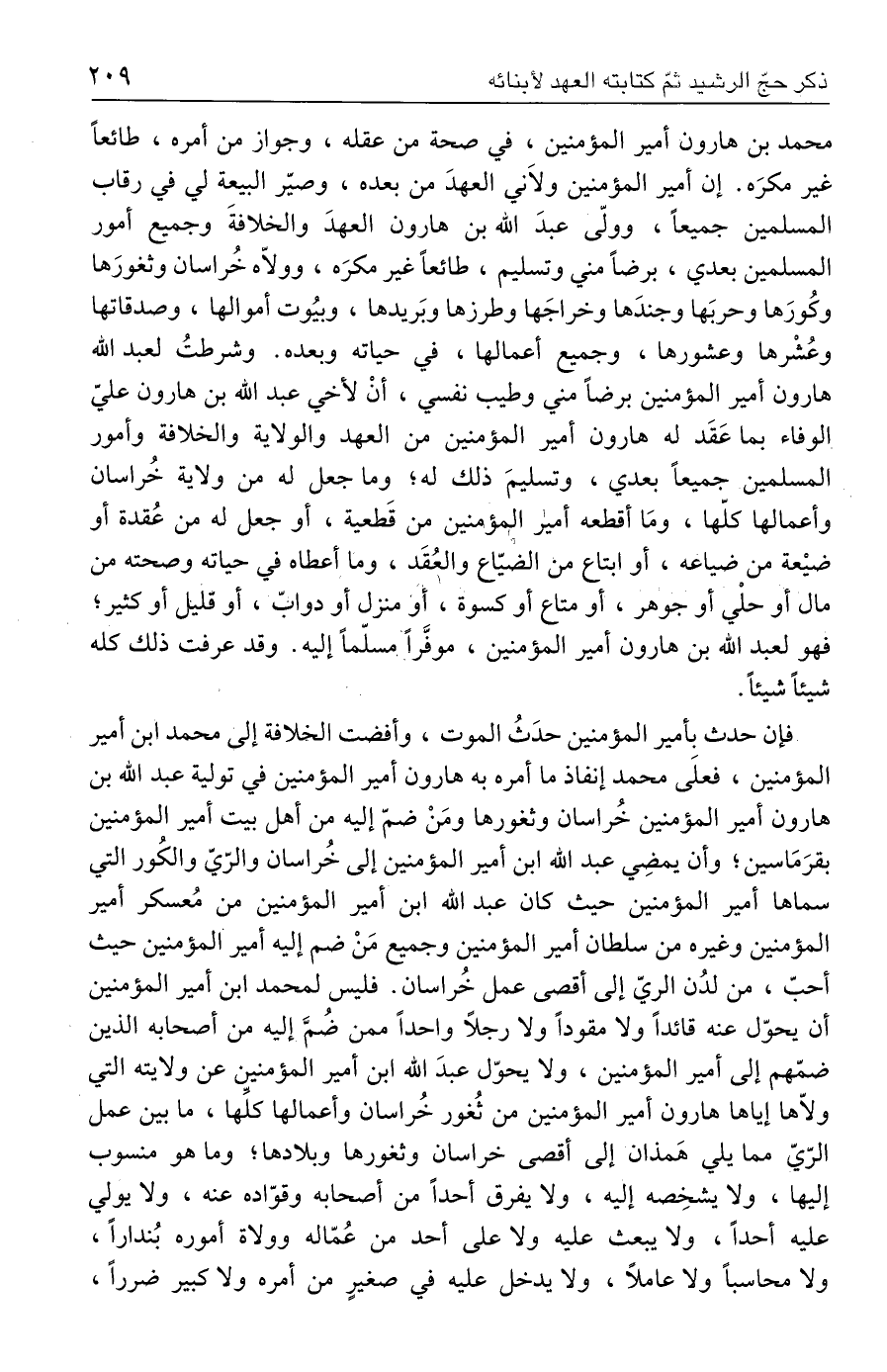 محمد بن هارون أمير المؤمنين، في صحة من عقله، وجواز من أمره، طائعًا غير مكرَه. إن أمير المؤمنين ولَاني العهدَ من بعده، وصيّر البيعة لي في رقاب المسلمين جميعًا، وولّى عبدَ الله بن هارون العهدَ والخلافةَ وجميع أمور المسلمين بعدي، برضًا مني وتسليم، طائعًا غير مكرَه، وولّاه خُراسان وثغورَها وكُورَها وحربَها وجندَها وخراجَها وطرزها وبَريدها، وبيُوت أموالها، وصدقاتها وعُشْرها وعشورها، وجميع أعمالها، في حياته وبعده. وشرطتُ لعبد الله هارون أمير المؤمنين برضًا مني وطيب نفسي، أنْ لأخي عبد الله بن هارون عليّ الوفاء بما عَقَد له هارون أمير المؤمنين من العهد والولاية والخلافة وأمور المسلمين جميعًا بعدي، وتسليمَ ذلك له؛ وما جعل له من ولاية خُراسان وأعمالها كلّها، ومَا أقطعه أمير المؤمنين من قَطعية، أو جعل له من عُقدة أو ضيْعة من ضياعه، أو ابتاع من الضيّاع والعُقَد، وما أعطاه في حياته وصحته من مال أو حلْي أو جوهر، أو متاع أو كسوة، أو منزل أو دوابّ، أو قليل أو كثير؛ فهو لعبد الله بن هارون أمير المؤمنين، موفَّرًا مسلّمًا إليه. وقد عرفت ذلك كله شيئًا شيئًا.