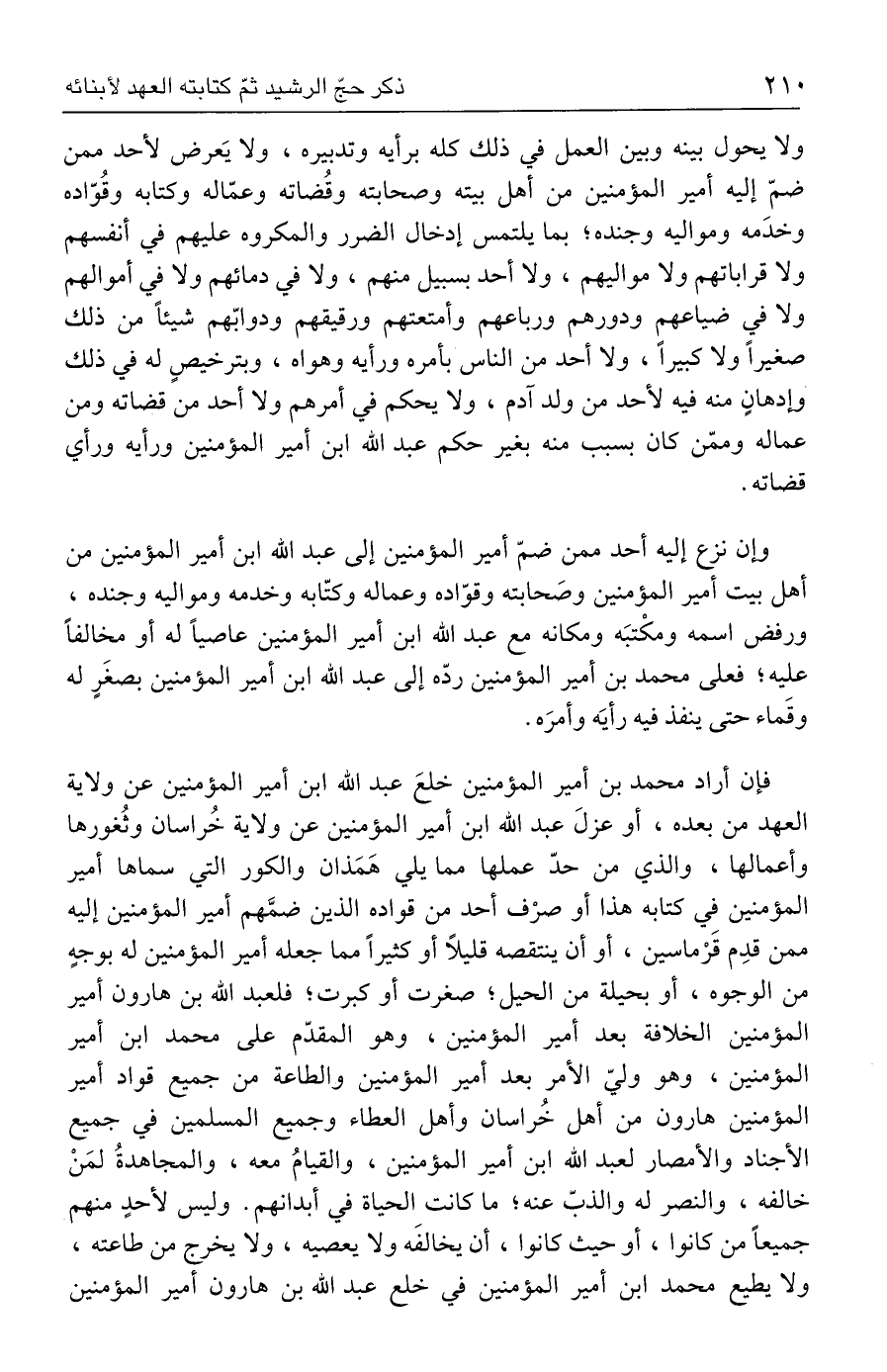 فإن أراد محمد بن أمير المؤمنين خلعَ عبد الله ابن أمير المؤمنين عن ولاية العهد من بعده، أو عزلَ عبد الله ابن أمير المؤمنين عن ولاية خُراسان وثُغورها وأعمالها، والذي من حدّ عملها مما يلي هَمَذان والكور التي سماها أمير المؤمنين في كتابه هذا أو صرْف أحد من قواده الذين ضمَّهم أمير المؤمنين إليه ممن قدِم قَرْماسين، أو أن ينتقصه قليلًا أو كثيرًا مما جعله أمير المؤمنين له بوجهٍ من الوجوه، أو بحيلة من الحيل؛ صغرت أو كبرت؛ فلعبد الله بن هارون أمير المؤمنين الخلافة بعد أمير المؤمنين، وهو المقدّم على محمد ابن أمير المؤمنين، وهو وليّ الأمر بعد أمير المؤمنين والطاعة من جميع قواد أمير المؤمنين هارون من أهل خُراسان وأهل العطاء وجميع المسلمين في جميع الأجناد والأمصار لعبد الله ابن أمير المؤمنين، والقيامُ معه، والمجاهدةُ لمَنْ خالفه، والنصر له والذبّ عنه؛ ما كانت الحياة في أبدانهم. وليس لأحدٍ منهم جميعًا من كانوا، أو حيث كانوا، أن يخالفَه ولا يعصيه، ولا يخرج من طاعته، ولا يطيع محمد ابن أمير المؤمنين في خلع عبد الله بن هارون أمير المؤمنين